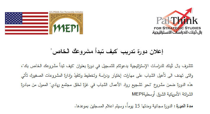 تتشرف بال ثينك للدراسات الإستراتيجية بدعوتكم للتسجيل في دورة بعنوان “كيف تبدأ مشروعك الخاص بك”، والتى تهدف الى تأهيل الشباب على مهارات إختيار ودراسة وتخطيط وتنفيذ وإدارة المشروعات الصغيرة، تأتي هذه الدورة ضمن مشروع “نحو تشجيع رواد الأعمال الشباب في غزة لخلق مجتمع ريادي” الممول من مبادرة الشراكة الأمريكية الشرق أوسطية MEPI مدة الدورة : […]