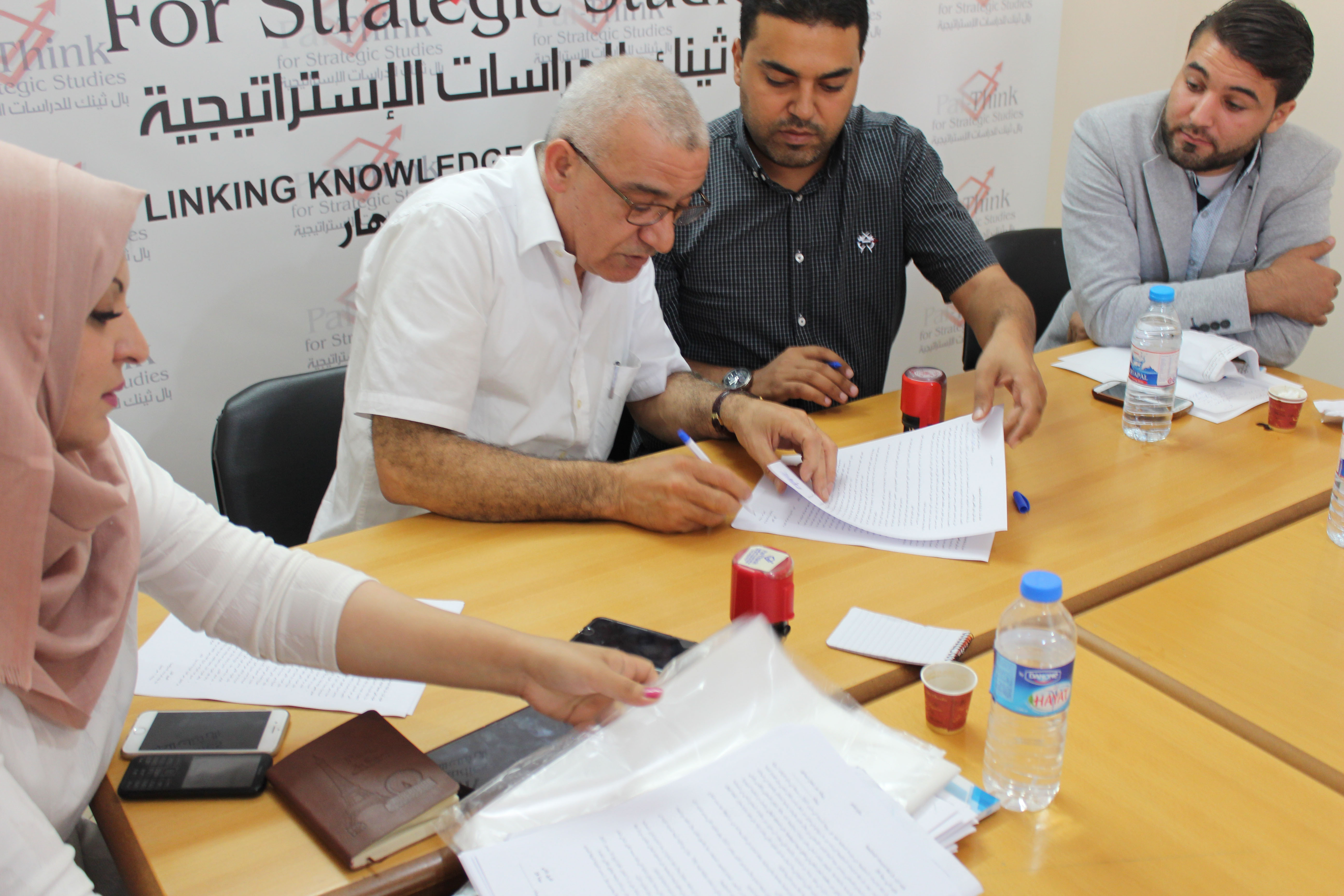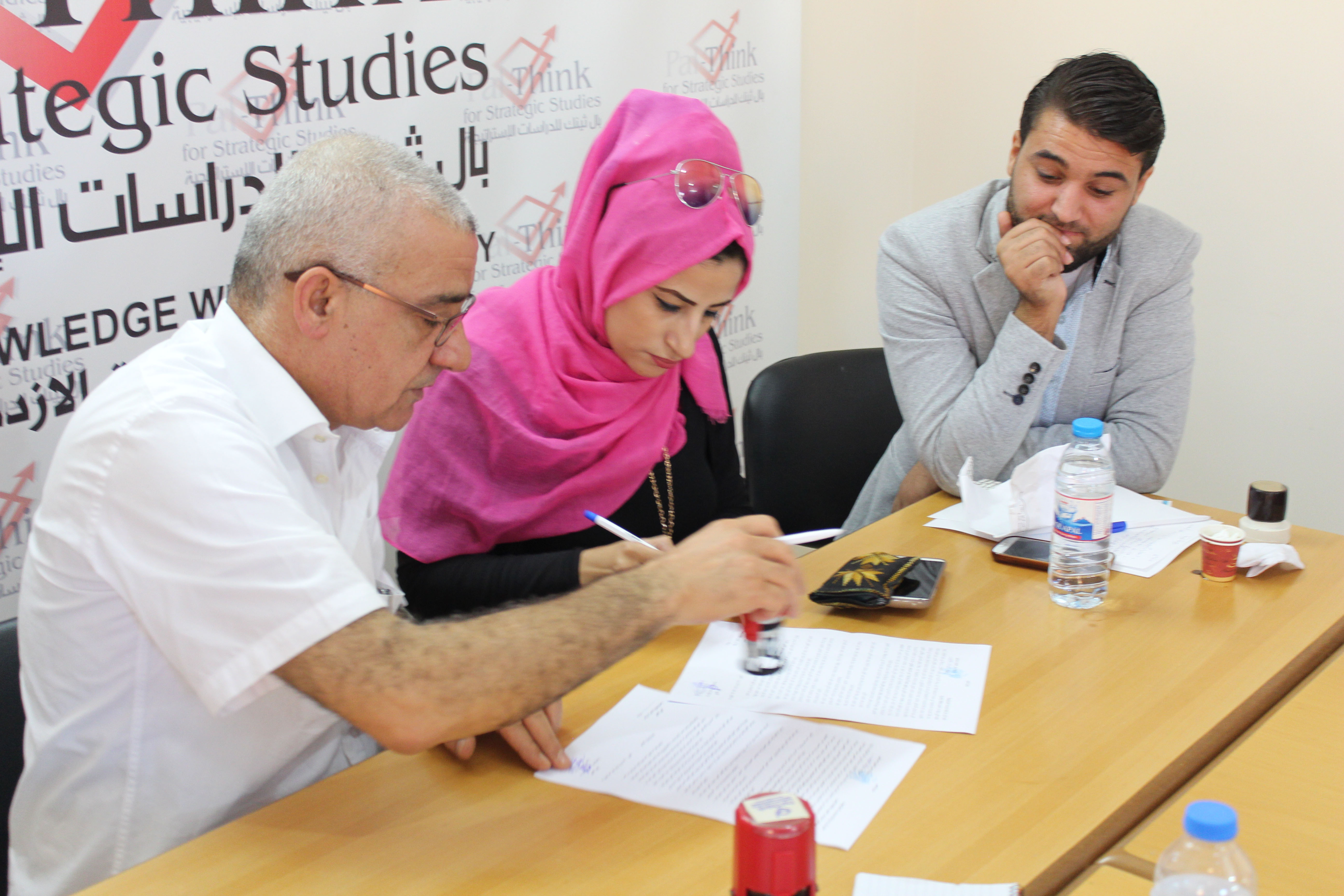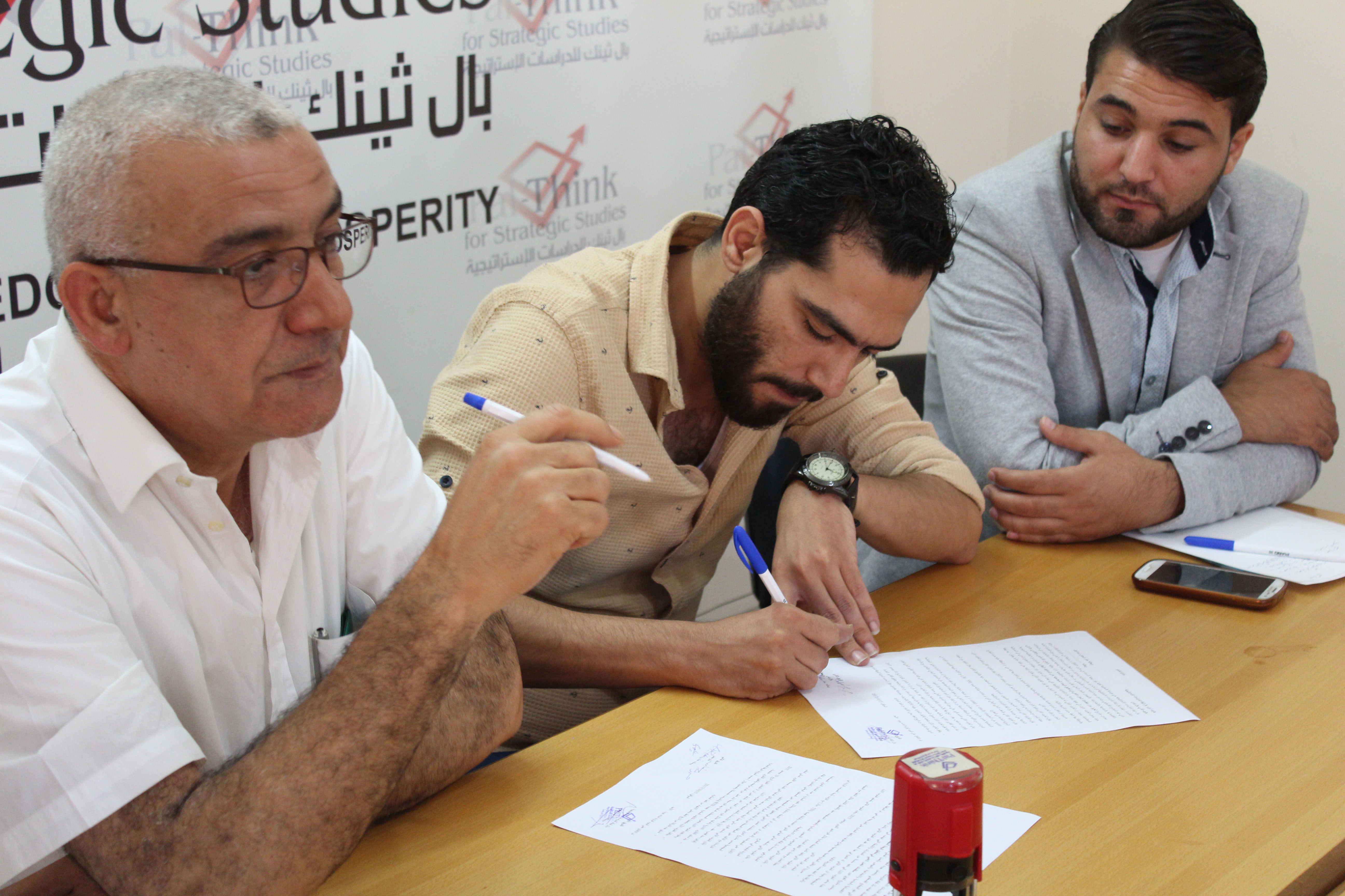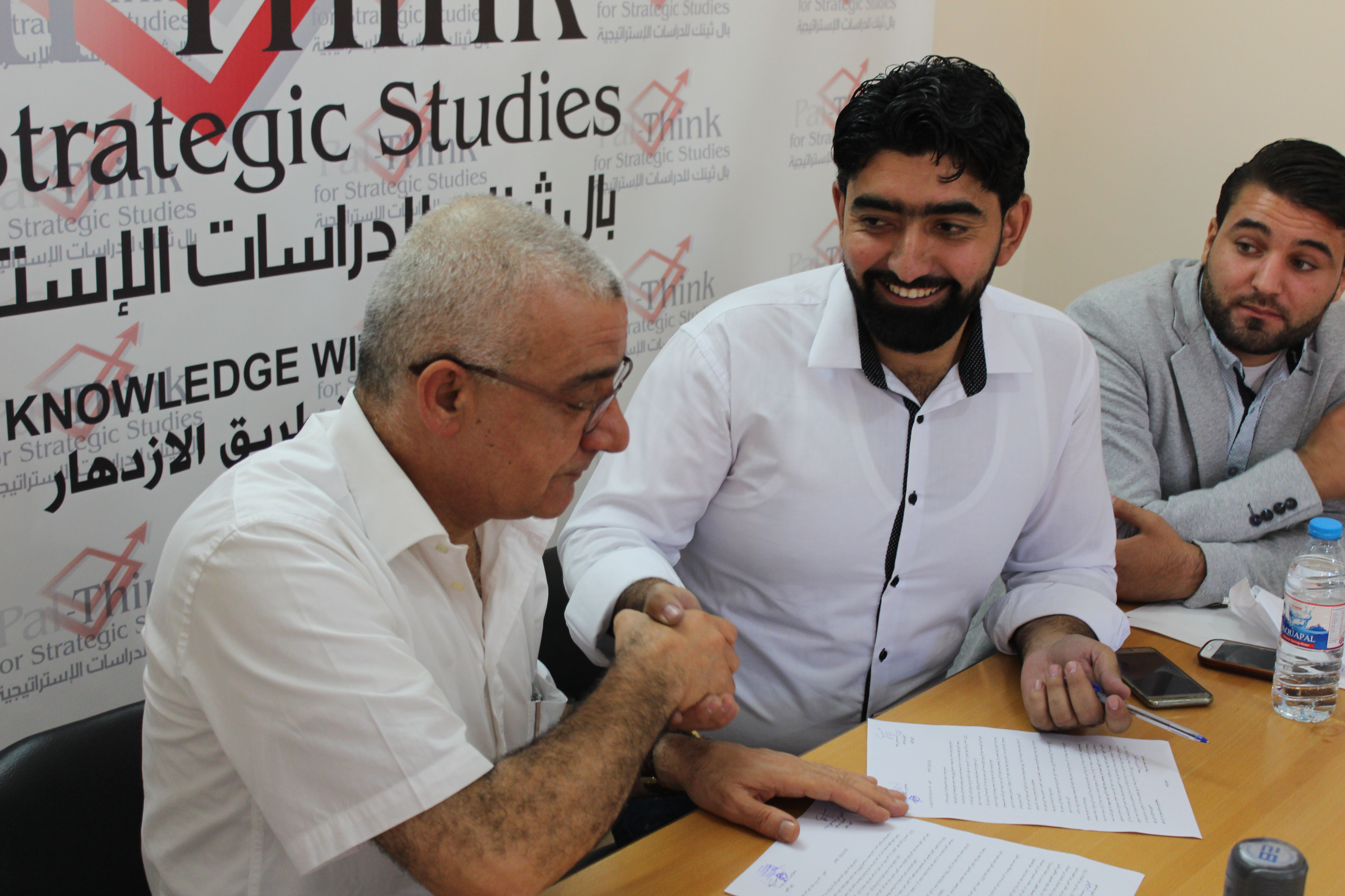 إيماناً بأن المصالحة الوطنية والمجتمعية الفلسطينية هي مهمة وطنية بإمتياز بما يستوجب تركيز الجهود جميعها في المجتمع الفلسطيني وتعزيز مشاركة الناس على كافة المستويات بكافة شرائحهم في عملية تحقيق التسامح والوحدة واستمراراً لعمل مؤسسة بال ثينك للدراسات الاستراتيجية في جهود المصالحة الوطنية المتواصلة منذ يونيو 2007، وقع مدير بال ثينك للدراسات الاستراتيجية أ. عمر شعبان هذا الاسبوع عدد من مذكرات التعاون مع العديد من المؤسسات الاهلية القاعدية في محافظات غزة والتي قدمت مبادرات لتنفيذ أنشطة وفعاليات على صعيد المجتمع وبالشراكة مع مؤسسات فلسطينية في محافظات الضفة الغربية بما يعزز العمل بين المؤسسات الاهلية القاعدية في محافظات غزة والشمال. وشدد شعبان خلال حفل التوقيع على اهمية المبادرات المجتمعية الابداعية في تعزيز قيم ومفاهيم المصالحة كثقافة مجتمعية في كافة المحافظات الفلسطينية وأهمية العمل المشترك بين محافظات القطاع والضفة الغربية الذي ترجمته أغلب المبادرات المنفذة أو تلك التي تحت التنفيذ. واستعرضت المؤسسات الشريكة المبادرات المجتمعية وأهدافها في تحقيق الوحدة المجتمعية والمصالحة الوطنية حيث تميزت هذه المبادرات بدرجة عالية من الجدية والابداع وانها مبادرات تتم مع الناس ضحيا الانقسام وعلى المستوى الوطني .