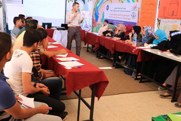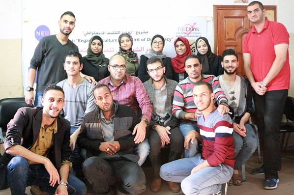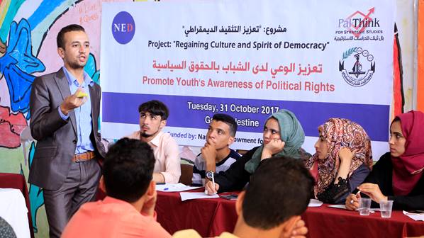 نفذت مؤسسة بال ثينك للدراسات الاستراتيجية ورشتين ضمن مشروع “تعزيز التثقيف الديمقراطي” الممول من الصندوق الوطني للديمقراطية NED ، احداهما في رفح والأخرى في خانيونس ، حيث يهدف المشروع إلى رفع وعي الشباب بالديمقراطية وأسسها وما يتعلق بها من حقوق يساهم في بناء قدرات الشباب وتأهيلهم للمشاركة في صنع القرار والرقي بالمجتمع .