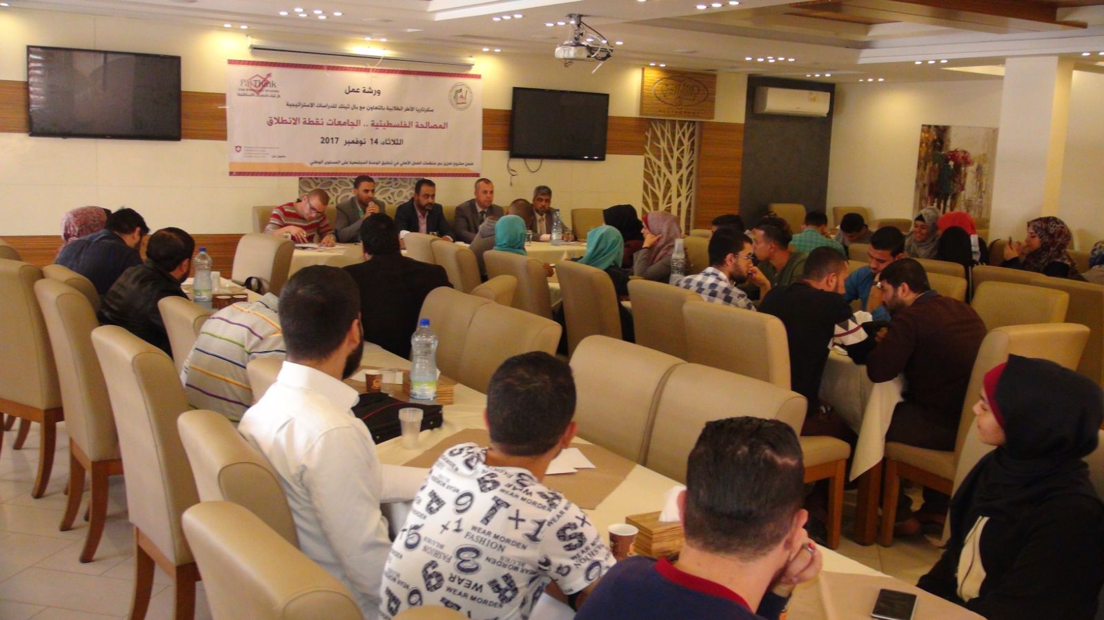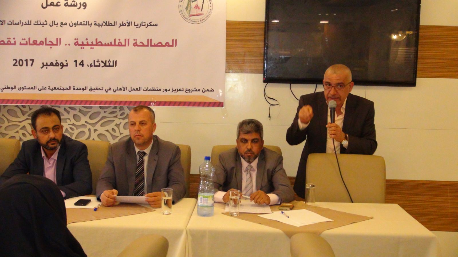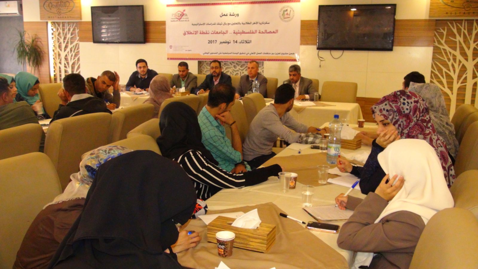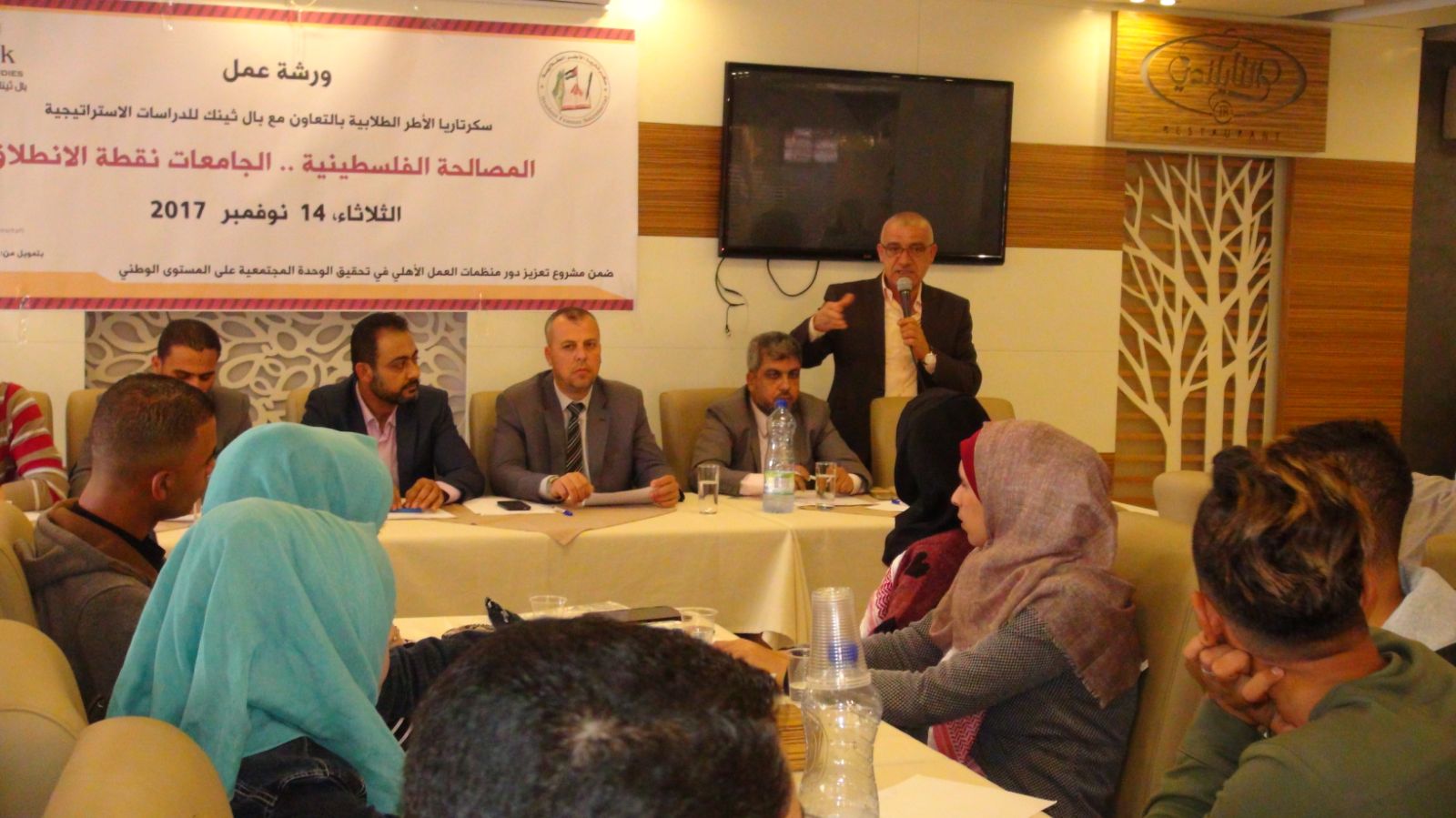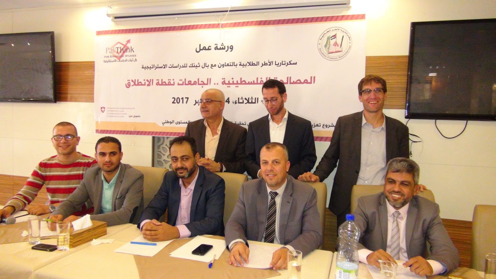 نظمت سكرتاريا الأطر الطلابية لقاء حوارياً بعنوان “المصالحة الفلسطينية .. الجامعات نقطة الانطلاق ” بالتعاون مع بال ثينك للدراسات الاستراتيجية ، وذلك بمدينة غزة بحضور مجموعة من أساتذة الجامعات وعدد من طلاب الجامعات والكتل الطلابية ووفد سويسري .