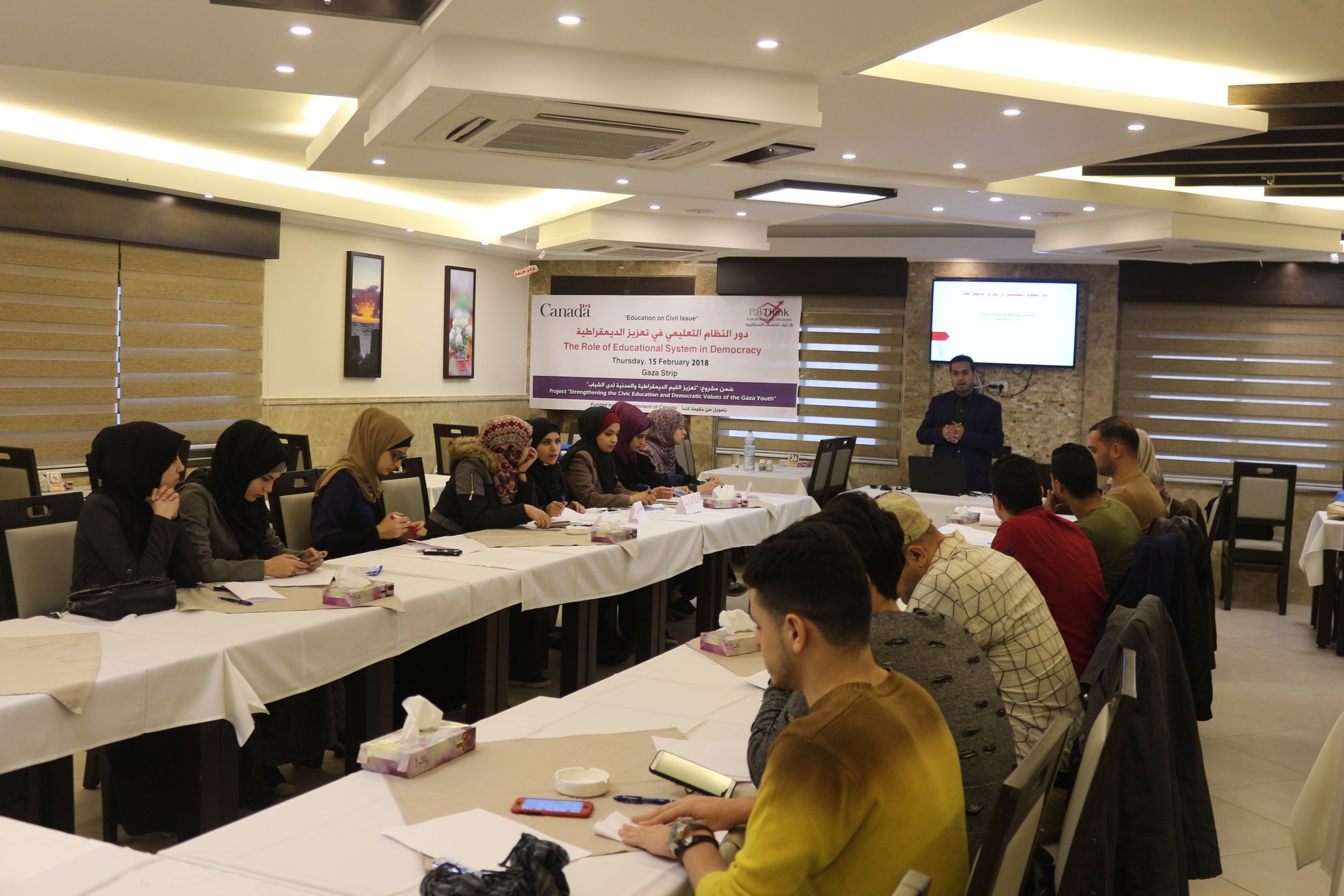 وقدم المحاضرة الدكتور إبراهيم أبو معمر، رئيس الجمعية الوطنية للديمقراطية والقانون ، وذلك بحضور 20 شاب وشابة من مختلف التخصصات الجامعية.
