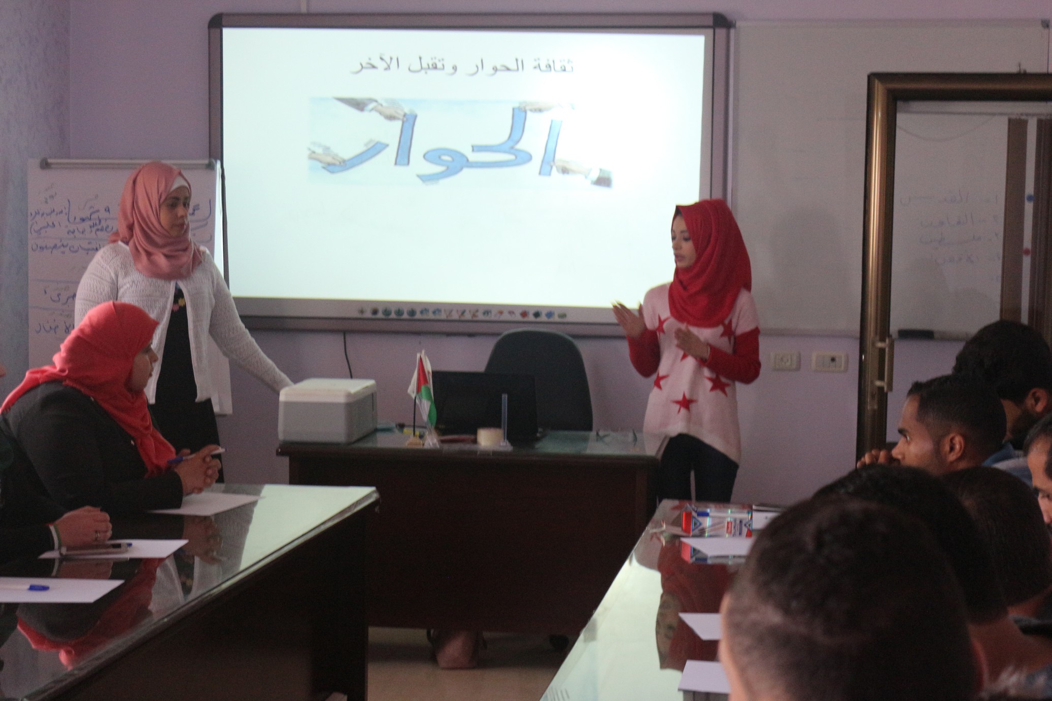 وسام أبو عوض، خريجة إدارة الأعمال ومتدربة اجتازت دورة إعداد المدربين المنفذة ضمن المشروع، بدأت اللقاء بعملية عصف ذهني للحضور حول صورة توضح اختلاف الرأي بين الأشخاص وكيف يمكن لكل طرف أن يقنع الآخر بما يراه صحيحاً، وتحدثت عن مفهوم كلمة الحوار، وأهدافه، حيث أن الهدف الأساسي من عملية الحوار هو إقامة الحجة، ودفع الشبهات، والآراء والأقوال الفاسدة، بالإضافة للعديد من الأهداف الفرعية الأخرى.