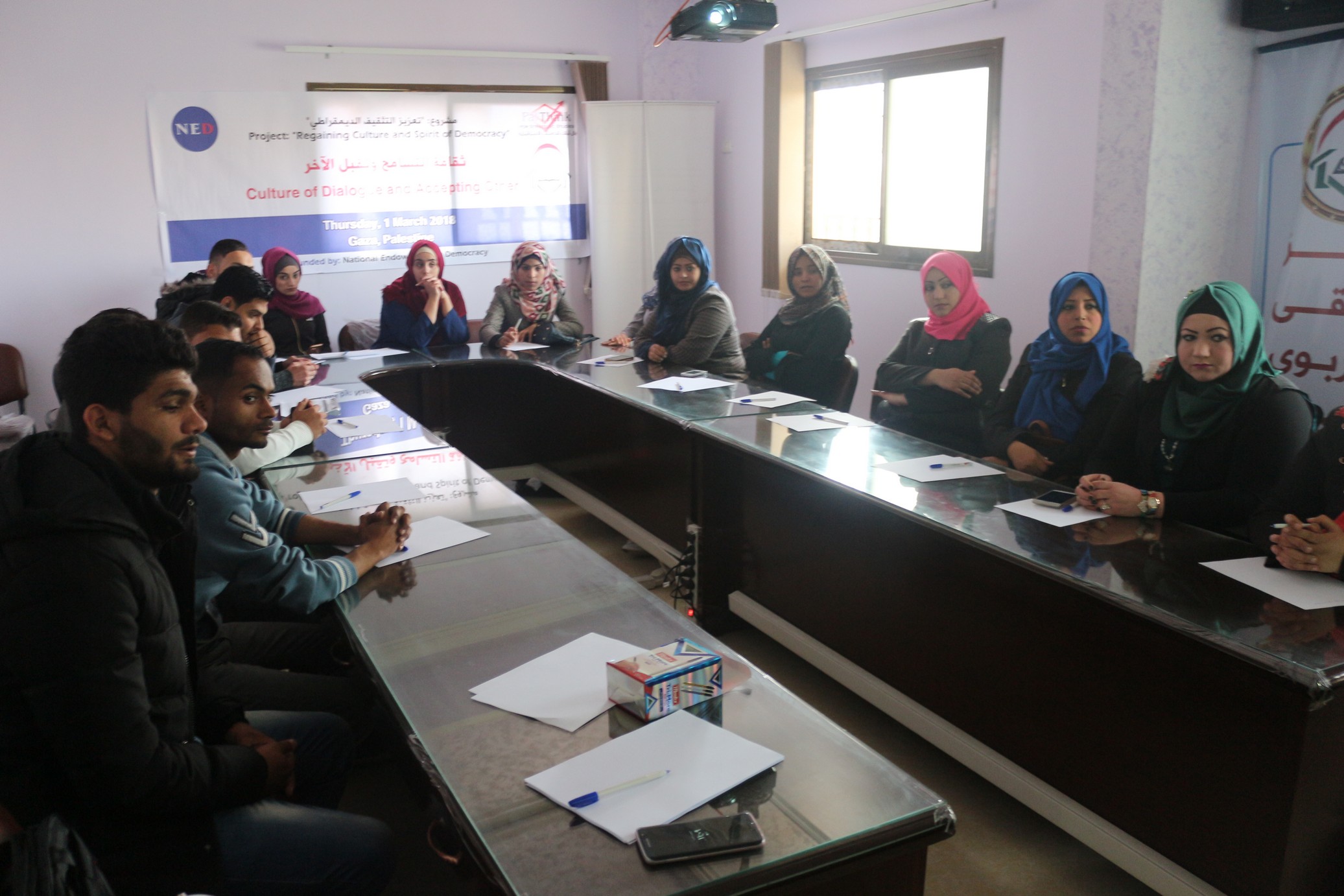 وحضر اللقاء الذي يهدف إلى توعية الشباب بأساليب الحوار وقيم التسامح وقبول الآخر والأثر الإيجابي لمثل هذه الثقافة في المجتمع الفلسطيني، قرابة 20 طالب وطالبة من تخصصات جامعية مختلفة.
