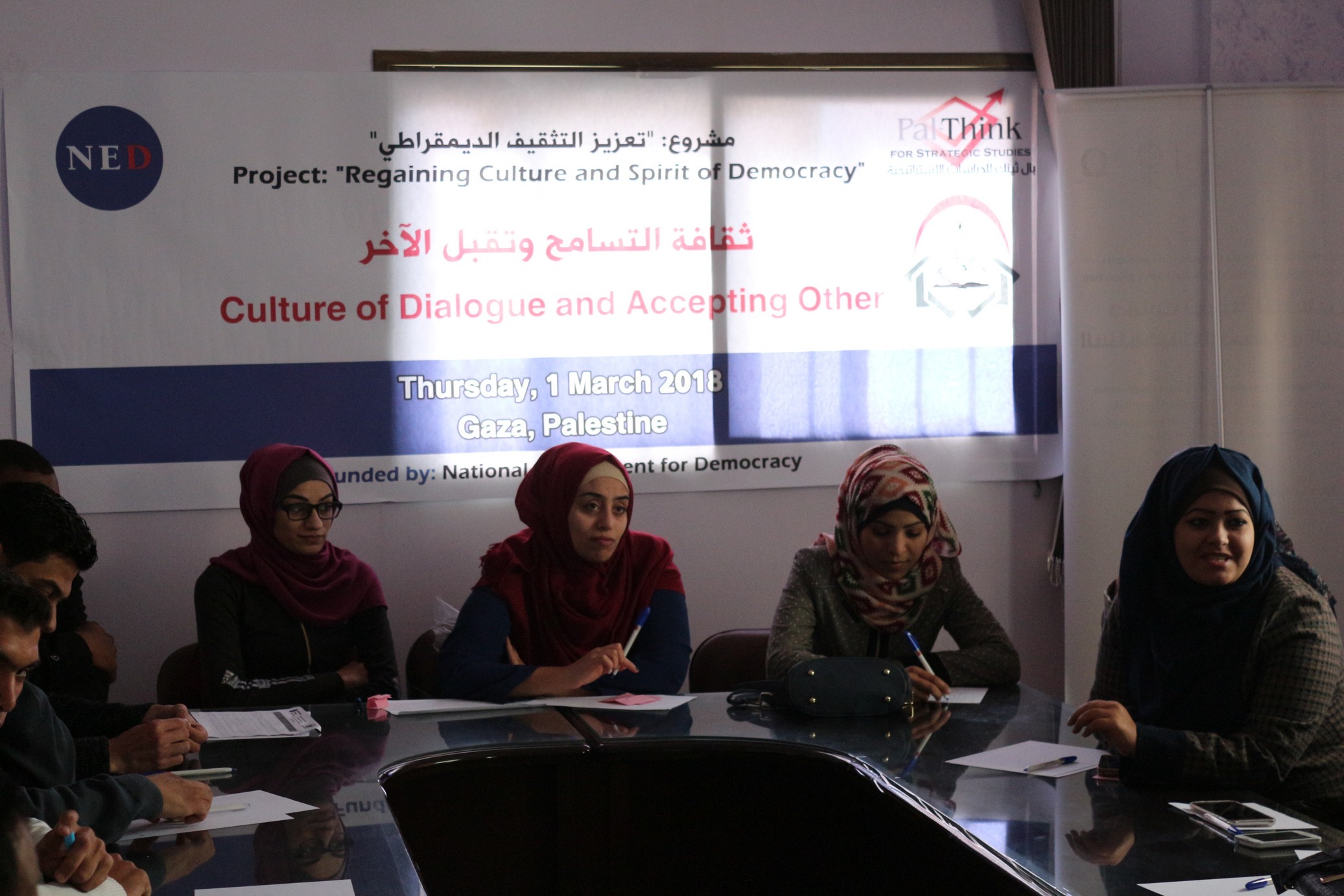 نفذت مؤسسة بال ثينك للدراسات الاستراتيجية ورشة عمل بعنوان “ثقافة الحوار وتقبل الآخر”، ضمن مشروع “تعزيز التثقيف الديمقراطي” الممول من الصندوق الوطني للديمقراطية (NDE)، المقام في جمعية الملتقى التربوي في النصيرات وسط قطاع غزة.