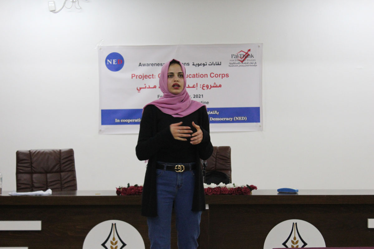يذكر أن ميسرين لقاءات التوعية هم مجموعة من طلاب وطالبات الجامعات الذين تم تدريبهم من قبل مؤسسة بال ثينك ضمن برنامج تدريبي مكثف استمر لمدة اسبوعين متواصلين تم خلالهم التركيز على قضايا الديمقراطية وحقوق الانسان ونظام الحكم في فلسطين ومبادئ النزاهة والشفافية والعنف المبني على النوع الاجتماعي.