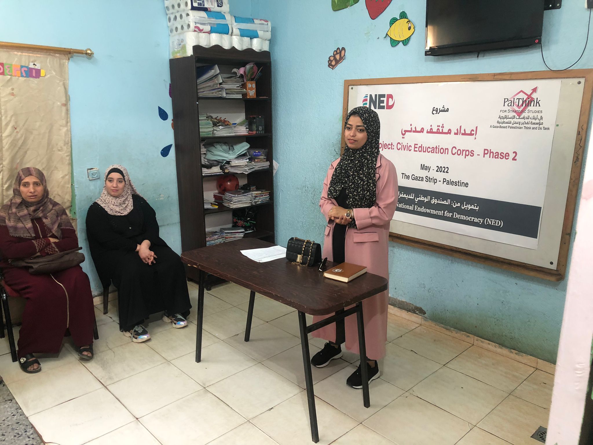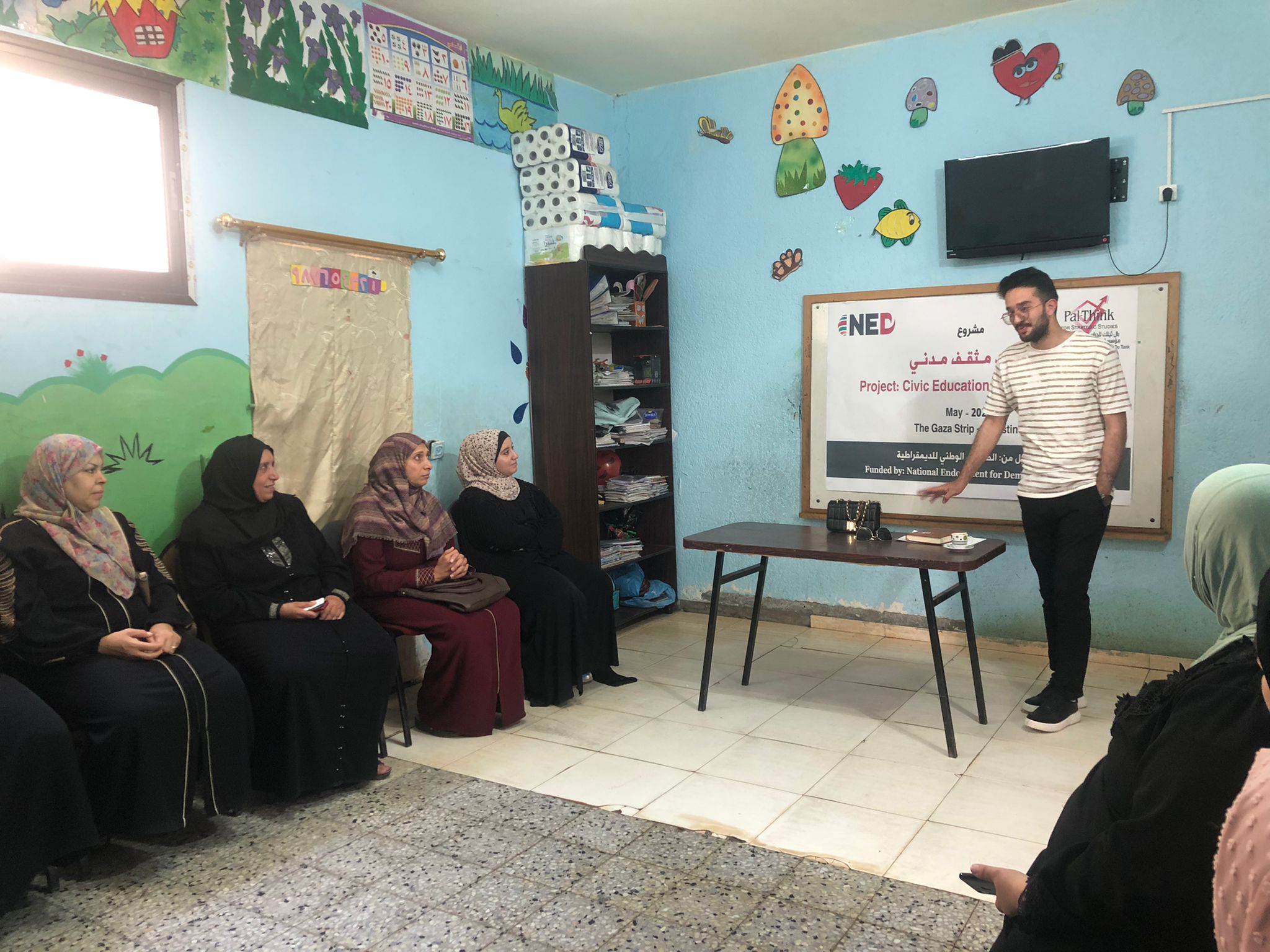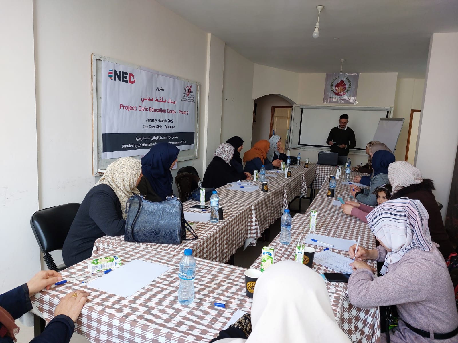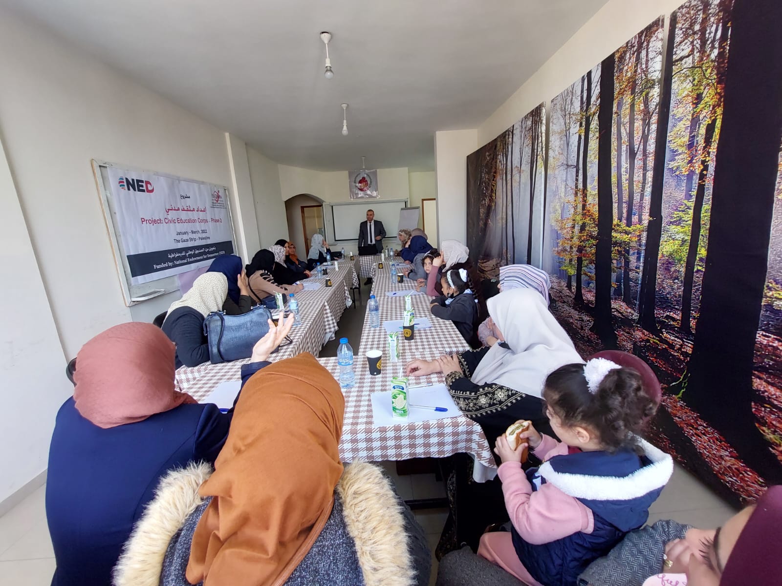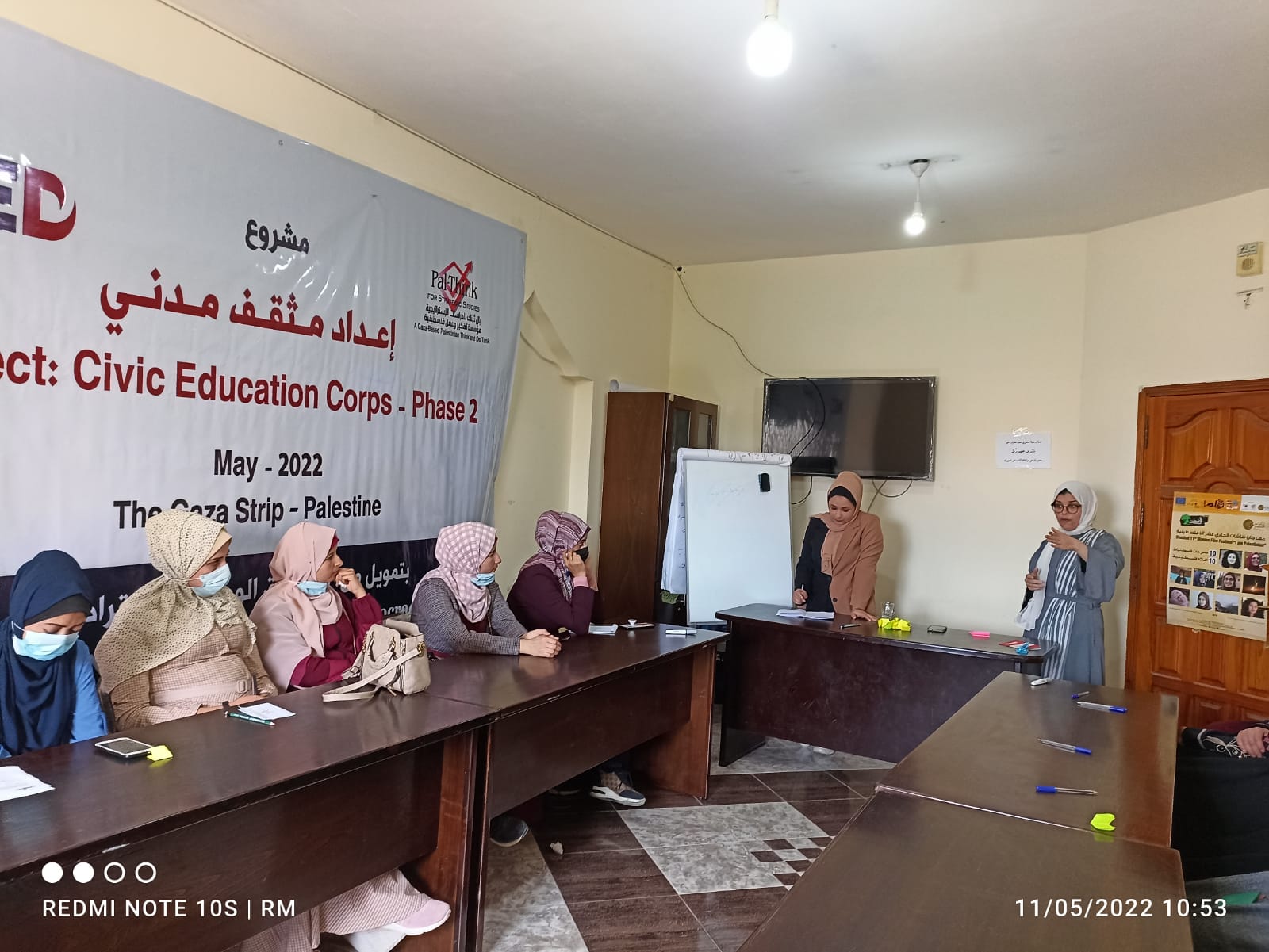 أما اللقاء الخامس فقد تم تنفيذه بعنوان “واقع النساء في قطاع غزة”، وذلك بالتعاون مع جمعية ميلاد لتنمية القدرات شمال غزة، وقد أدار اللقاء أعضاء هيئة التثقيف المدني ” سامي شقورة، ألماظة عودة”.