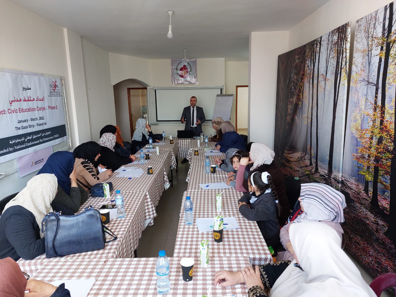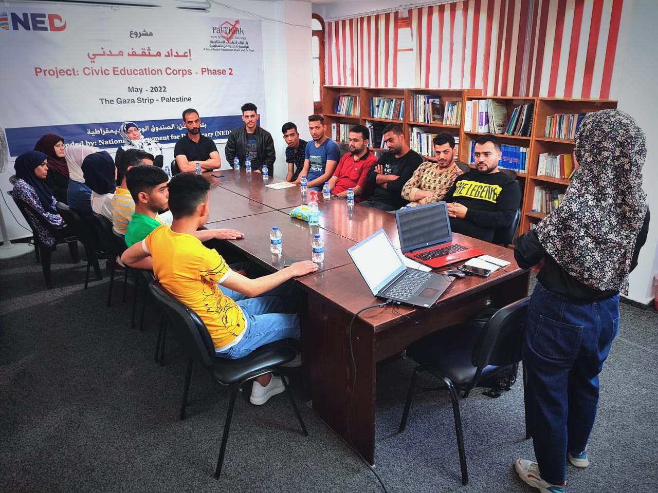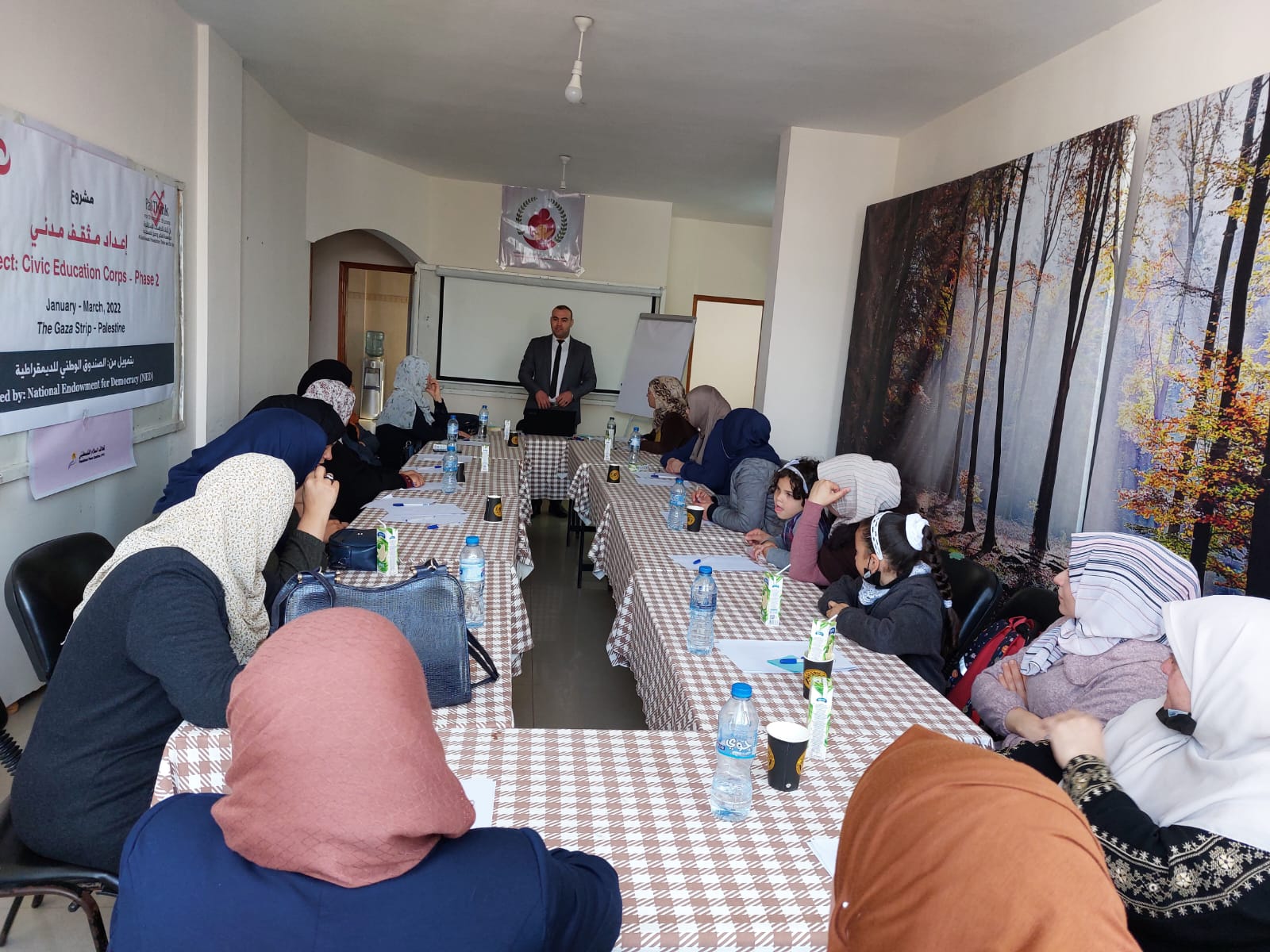 وقد أدار اللقاء أعضاء هيئة التثقيف المدني ” سامي شقورة، أنس العزازي”، والذين بدورهم تحدثوا حول مفهوم الديمقراطية، وخصائصها، وأهم مميزاتها، وأسس العملية الديمقراطية، كما وبينوا أهم خصائص النظام الديمقراطية والتي من أهما أن يعمل على صيانة الحقوق والحريات العامة من خلال الوثائق المكتوبة الخاصة به، والفصل بين السلطات واستقلال القضاء وغيرها من الخصائص، وحماية حقوق الأقليات، كما وتحدثوا حول مفهوم المشاركة السياسية وأهميتها، ومجموعة القيم التي تتضمنها المشاركة السياسية، كما واستعرضوا محددات المشاركة والسياسية ومستوياتها.