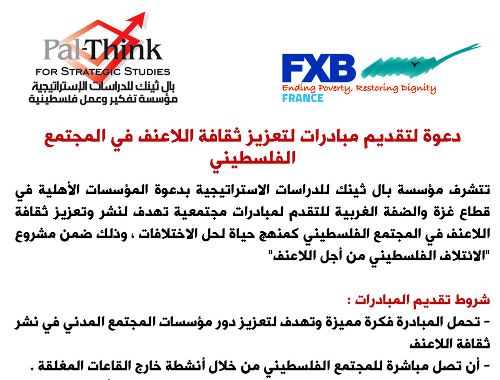 تتشرف مؤسسة بال ثينك للدراسات الاستراتيجية بدعوة المؤسسات الأهلية في قطاع غزة والضفة الغربية للتقدم لمبادرات مجتمعية تهدف لنشر وتعزيز ثقافة اللاعنف في المجتمع الفلسطيني كمنهج حياة لحل الاختلافات، وذلك ضمن مشروع “الائتلاف الفلسطيني من أجل اللاعنف” شروط تقديم المبادرات : • تحمل المبادرة فكرة مميزة وتهدف لتعزيز دور مؤسسات المجتمع المدني في نشر ثقافة […]