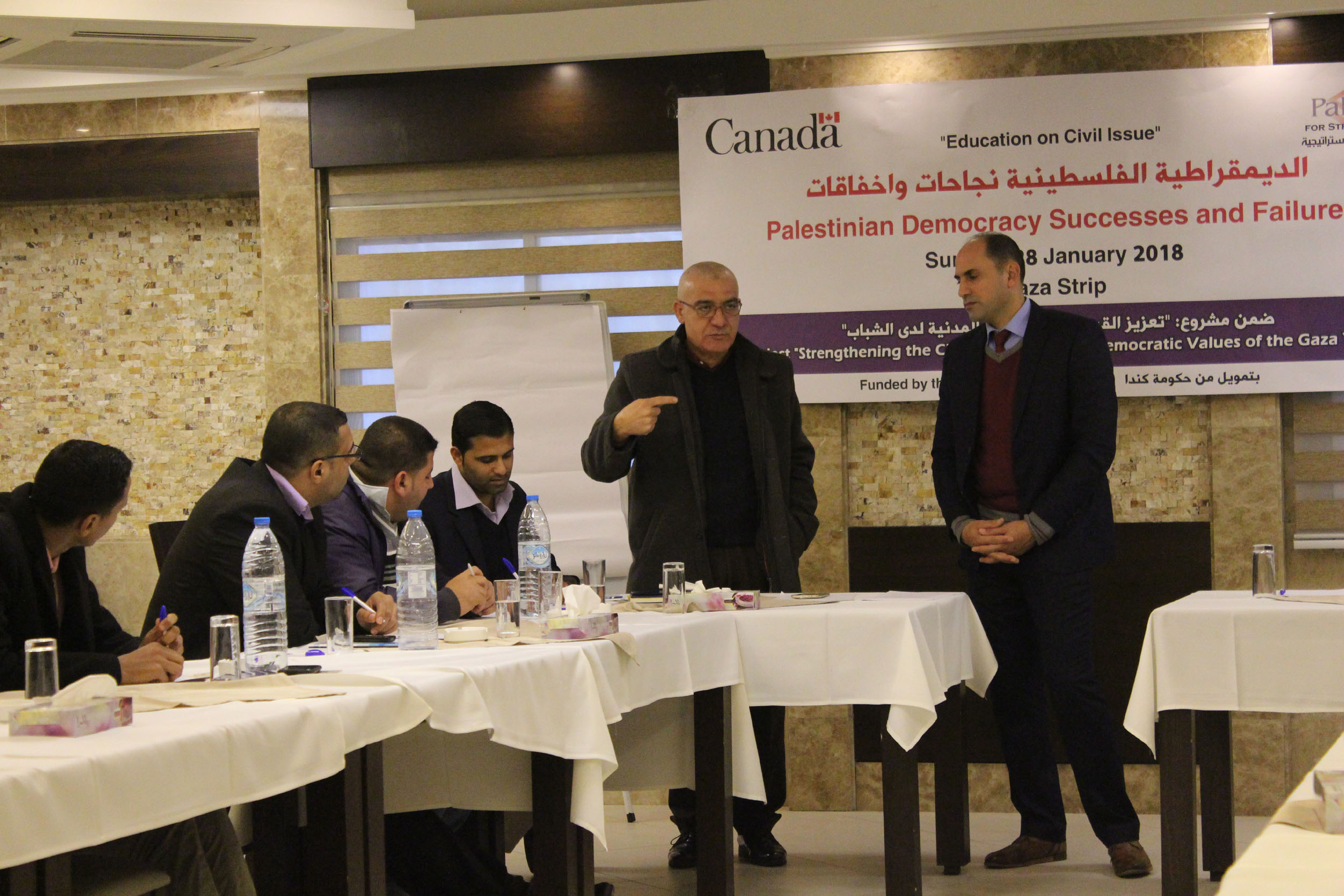 As a part of “Promoting Democratic and Civic values for Youth” Project, Pal-Think for Strategic Studies held the eighth session, entitled “Palestinian Democracy: Inroads and failures” in the Gaza Strip. The session was presented by the writer and political analyst ,Mansour Abu Karim, with the participation of a group of 20 young men and women from several universities and governorates.