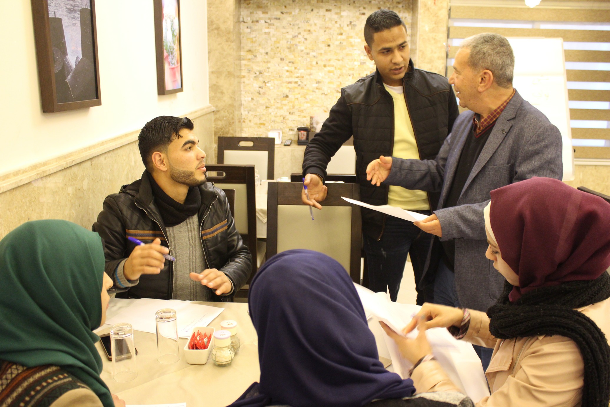 Mr. Mansour Abu Karim began his session by talking thoroughly about the democratic experience of the Palestinian situation. He contended, “We, as young people, are caring about the Palestinian situation, studying and analyzing it to reach clear convictions, to learn about the strengths and how to promote them; what are the weaknesses and how to avoid them.” Furthermore, he reviewed the Palestinian democratic experiment and the history of elections with regard to the Palestinian situation, explaining the stages it underwent and the beginning of forming a Palestinian identity and national identity. He discussed with the participants the concept of democracy and elections and the suffering of the Palestinian situation, confirming the need to strengthen the rule of the people as a basic source for democracy. Very motivated, he expressed how we, citizens, need to be motivated enough to consolidate participation in elections, without allowing anyone to take advantage of our circumstances. Participants understood how people should be fully aware of the importance elections and democracy. Eventually, participants were divided into two groups: one representing strengths and the other weaknesses in order to review the Palestinian democratic situation and identify its failures and successes.