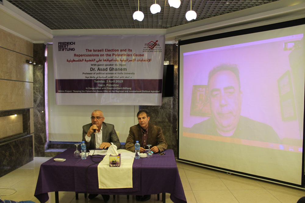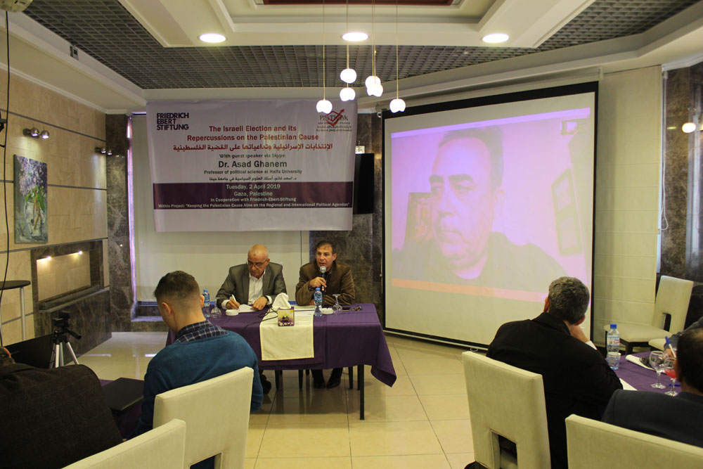 The roundtable entitled ‘The Israeli Election and its repercussions on the Palestinian Cause’ implemented in partnership with Friedrich-Ebert-Stiftung within the project “Keeping the Palestinian Cause Alive on the Regional and International Political Agendas.” The session took place on Tuesday, April 2, 2019, at the level-up restaurant, Gaza City. The Guest Speaker is Dr. Asad Ghanem.