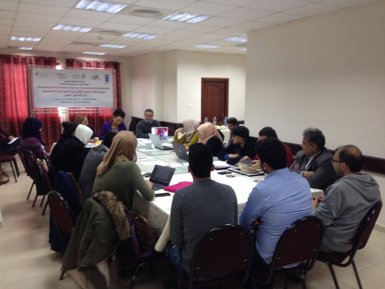 واكد المشاركون ضرورة استمرار العمل في مثل هذه المبادرات لاستغلال طاقات الشباب وانهاء الانقسام والتشبيك مع المزيد من مؤسسات المجتمع المدني، للضغط والحشد على صناع القرار لإنجاح أي مبادرات قادمة, وتبني التوصيات والمخرجات لورشة العمل الختامية واهمها تشكيل تجمع من المؤسسات القاعدية في فلسطين التي تعمل كفريق واحد على تعزيز الوحدة الوطنية والمصالحة المجتمعية بشل دائم. أكد المشاركون الي أهمية استخدام وسائل الاعلام بإيصال الرسالة الاعلامية والتغلب على الحصار الاسرائيلي الذي يقسم شطري الوطن.أحد المخرجات الهامة للمشروع تتمثل في مواصلة المؤسسات المشاركة في المشروع عملها كفريق وطني يعمل على تحقيق المصالحة والوحدة الوطنية بشكل دائم.