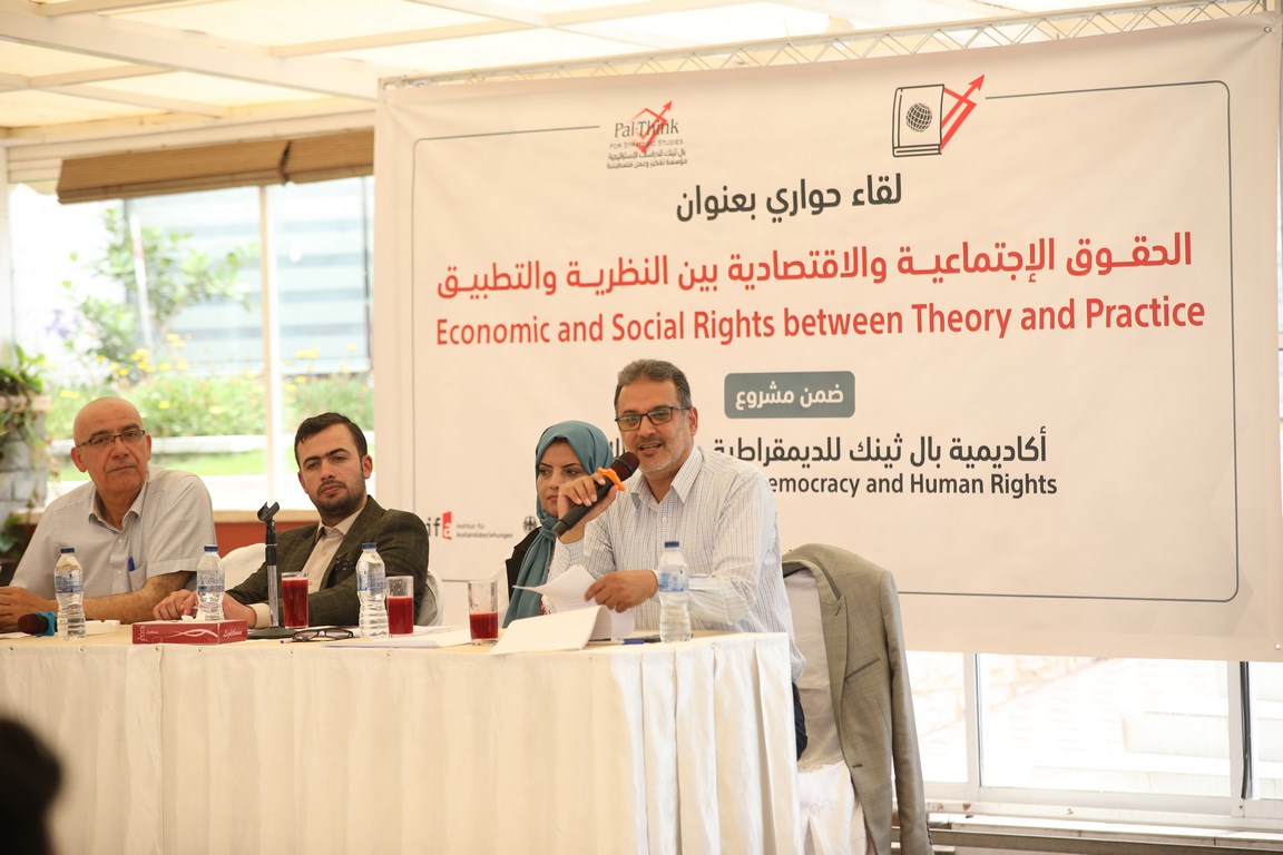 خلال كلمته الافتتاحية أوضح عمر شعبان، مدير مؤسسة بال ثينك أهمية النقاش والحوار حول طبيعة الفجوة القائمة بين النص القانوني والتطبيق العملي للحقوق الاجتماعية والاقتصادية في المجتمع الفلسطيني وما آلت إليه الأوضاع بعد سنوات طويلة من الانقسام. وأشار إلى أنشطة بال ثينك المتنوعة لخدمة المجتمع الفلسطيني ومحاولتها الدائمة في طرح معالجات موضوعية حول الانقسام وآثاره الكارثية، في البرامج والمشاريع التي تنفذها بال ثينك، والتي يأتي من ضمنها “مشروع أكاديمية بال ثينك للديمقراطية وحقوق الإنسان”.