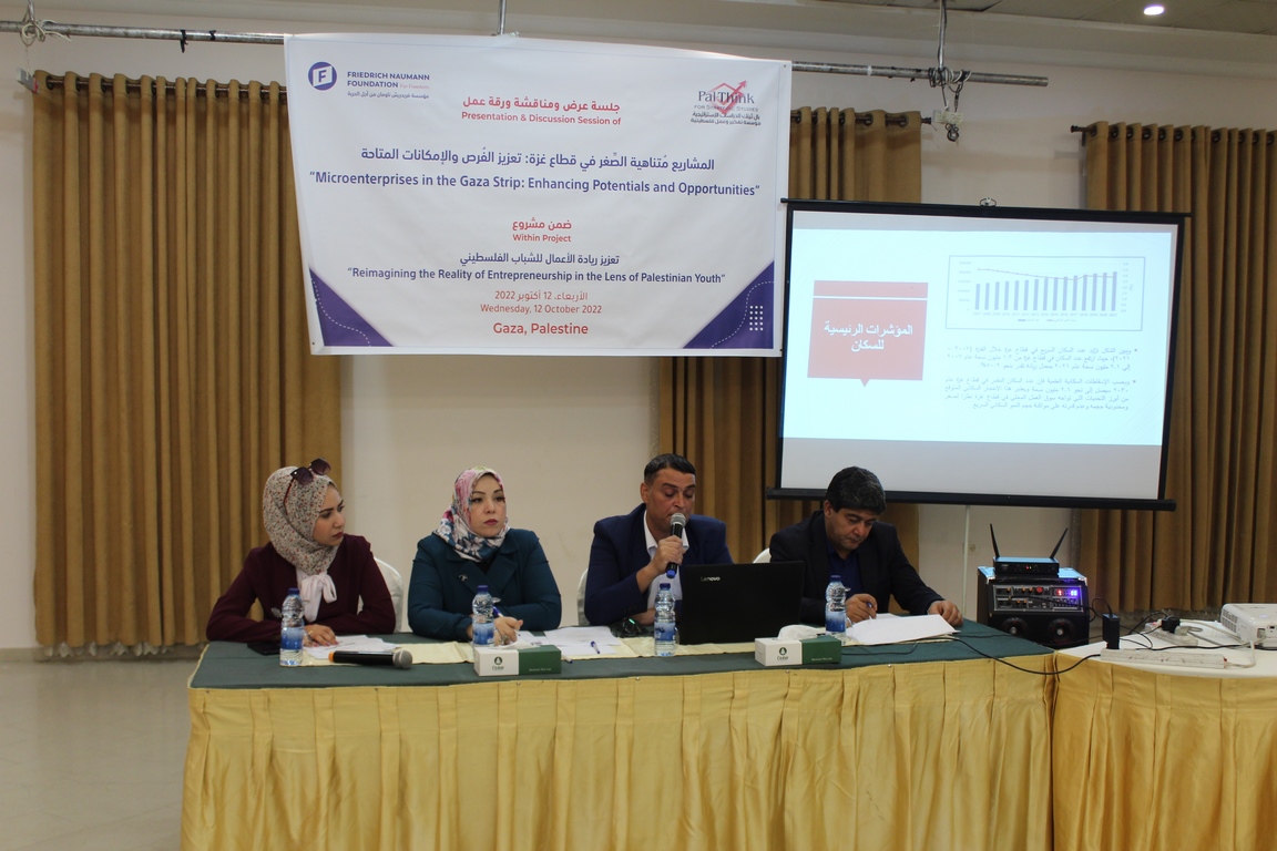 استمرارًا لسعيها الدؤوب في تسليط الضوء على سبل تحسين الاقتصاد في قطاع غزة، عقدت مؤسسة بال ثينك للدراسات الاستراتيجية بالتعاون مع مؤسسة فريدريش ناومان من أجل الحرية، جلسة حوارية لمناقشة ورقة عمل حول “المشاريع متناهية الصغر في قطاع غزة: تعزيز الفرص والإمكانات المتاحة” لـلباحث د. رائد حلس، ضمن مشروع تعزيز ريادة الأعمال للشباب الفلسطيني، بمشاركة عدد من الباحثين الاقتصاديين وممثلي المجتمع المدني ومؤسسات حكومية.