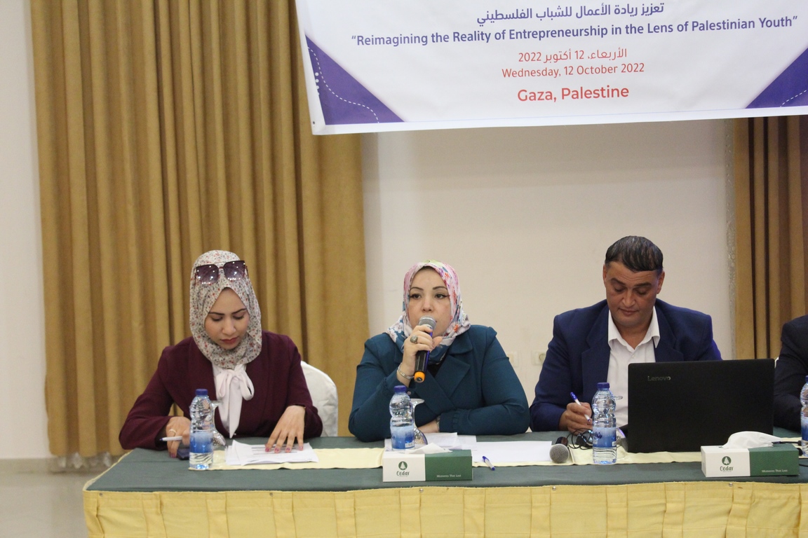ويسرت الجلسة سها سكر وهي إحدى متدربات المشروع، وافتتح الجلسة الباحث يحيى قاعود بالترحيب بالحضور، وقال إن هذا المشروع يسعى لنشر ثقافة ريادة الأعمال بين الشباب ومعالجة العقبات والصعوبات التي تواجههم في إطلاق مشاريعهم الخاص من خلال أوراق بحثية علمية محكمة لتقديمها لصناع القرار.