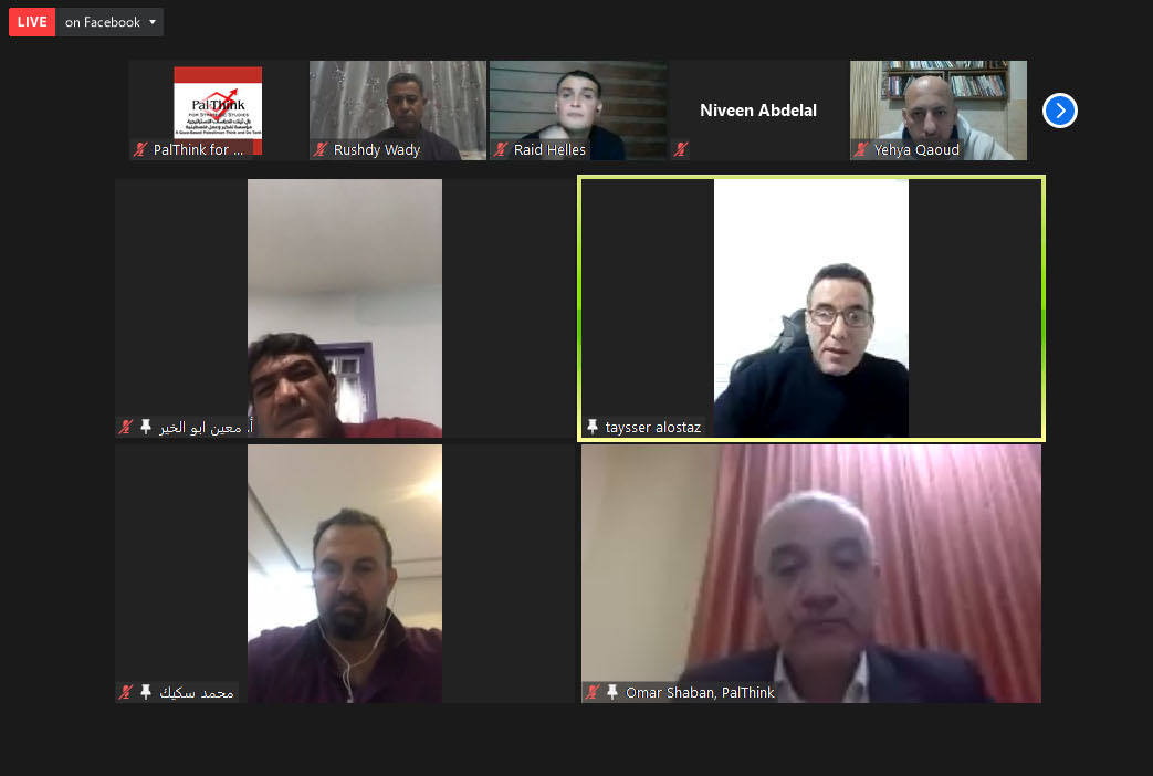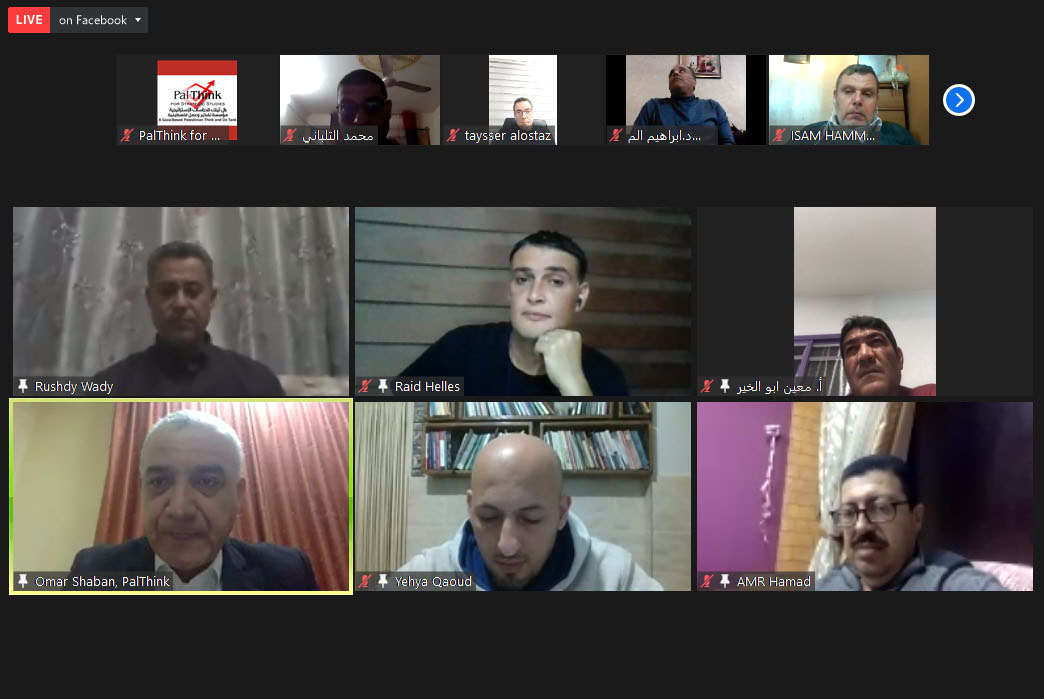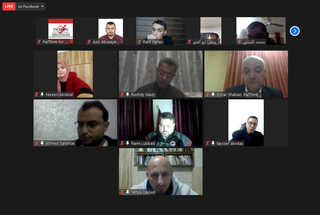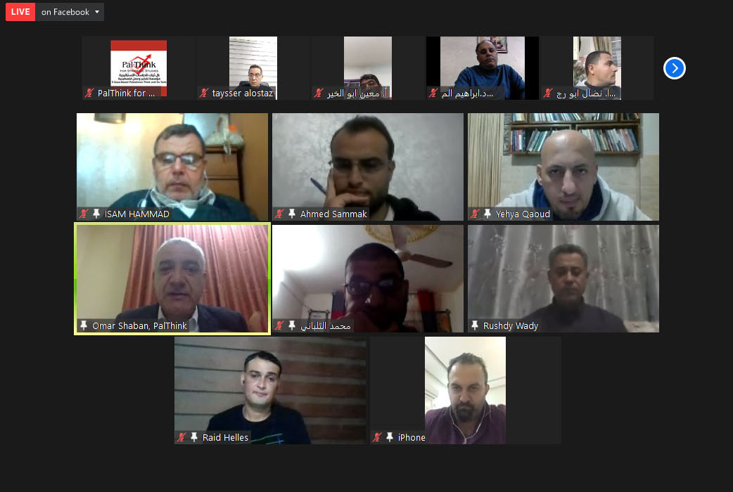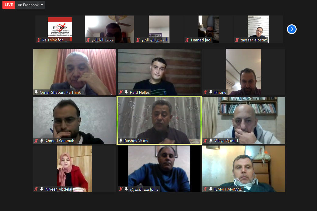 نظمت بال ثينك للدراسات الاستراتيجية جلسة نقاش عبر برنامج الزوم لمناقشة ورقة بحثية بعنوان “أثر أزمة كورونا على القطاع الاقتصادي في قطاع غزة”، بمشاركة وكيل وزارة الاقتصاد في غزة د. رشدي وادي، ورئيس اتحاد صناعات الملابس أ. تيسير الأستاذ، ومدير الهيئة الفلسطينية للمطاعم والفنادق والخدمات السياحية أ. معين أبو الخير، ومدير مركز التجارة الفلسطيني بال تريد أ. محمد سكيك، ونائب اتحاد المقاولين أ. أسامة كحيل، ولفيف من الباحثين وممثلي منظمات مجتمع مدني.