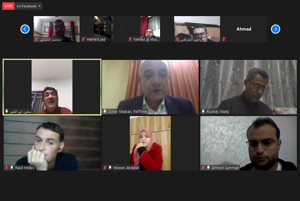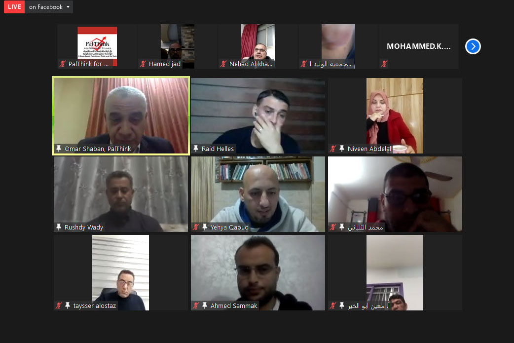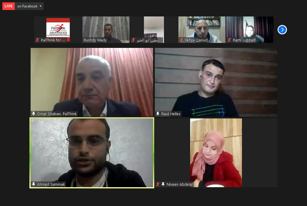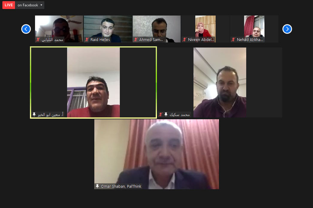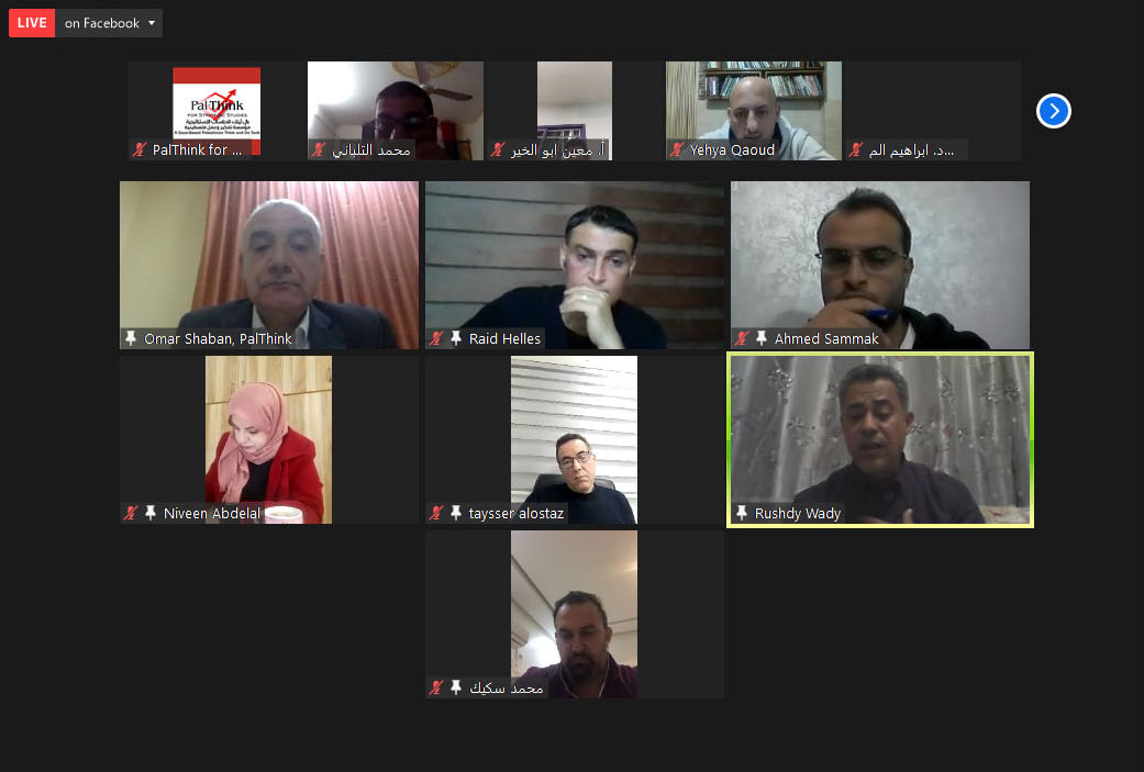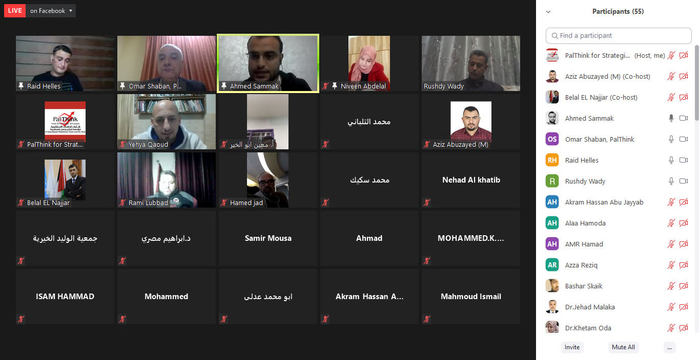 وافتتح الجلسة مدير المؤسسة أ. عمر شعبان بالترحيب بالحضور، وقال: “بال ثينك مؤسسة أهلية غير ربحية مستقلة تهدف للوصول إلى الحقيقة وعرضها، ، ولها باع طويل في المصالحة المجتمعية، حيث أنتجت ورقة المصالحة بالشراكة مع الممثلية السويسرية التي تعالج ملف الموظفين. تعمل بال ثينك على جلب كفاءات شابة جديدة وإعطاءهم فرص لتقديم أنفسهم. وتعزز البحث العلمي الرصين والمحايد والمتزن”. وأشار إلى أن القطاع الخاص الفلسطيني والذي يشكل قاطرة التنمية الاقتصادية- له دور كبير في خلق فرص العمل وفي تحقيق التنمية، يعيش أزمات متواصلة منذ بداية الحصار والانقسام، جاءت أزمة كورونا لتصب الزيت على النار. وأفاد شعبان أنه على الرغم من تعرض القطاع الخاص لأزمات متعددة بعضها متعلق بالعوامل الذاتية وبعضها متعلق بظروف دولية مثل شح التمويل الدولي والحصار ومنع دخول بعض السلع والتصدير، وتضرر بعض القطاعات الاقتصادية بسبب أزمة كورونا، إلى أن بعض القطاعات الأخرى استفادت، وهذا مؤشر على قدرة القطاع الاقتصادي على التكيف والاستفادة من الأزمات.