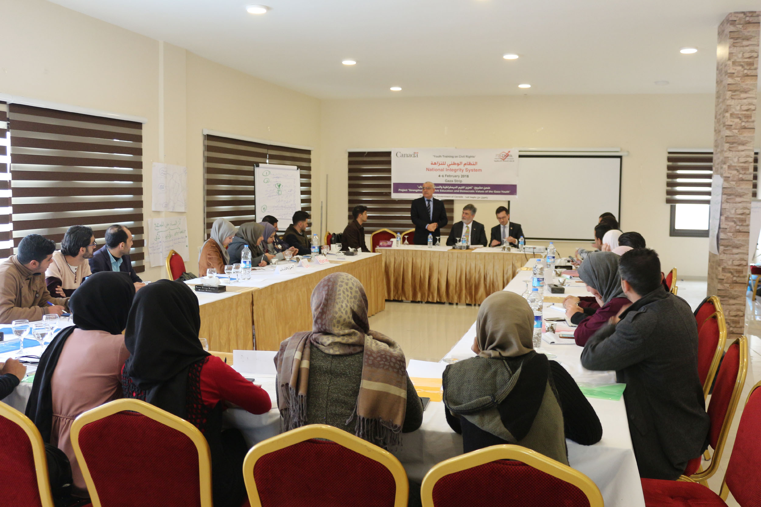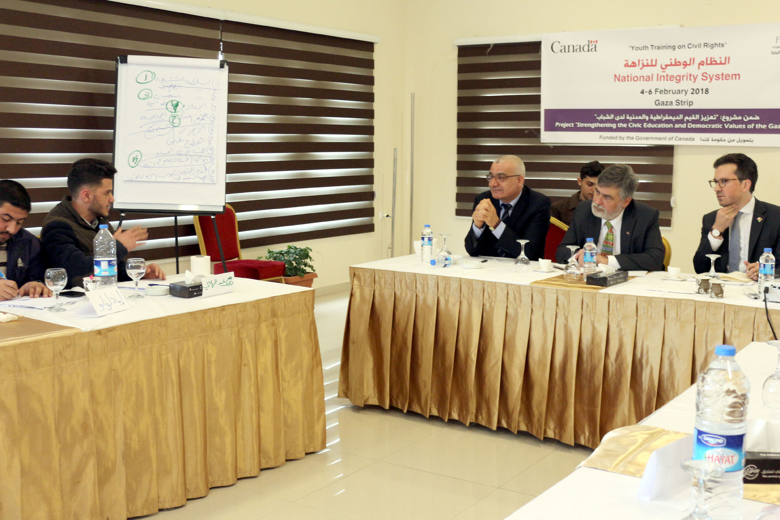 حيث رحب السيد عمر شعبان مدير مؤسسة “بال ثينك” للدراسات الاستراتيجية بممثل كندا لدى السلطة الفلسطينية السيد دوغلاس سكوت براودفوت، ورئيس القسم السياسي السيدايان أندرسون وقدم السيد عمر شعبان ممثل كندا للمشاركين، واكد على اهمية التعاون فيما بين الحكومة الكندية ومؤسسة بال ثينك في تنفيذ برنامج يهدف إلى تعزيز التثقيف الديموقراطي وأسس الشفافية والنزاهة بين الشباب في قطاع غزة، مشيرا الى دور المؤسسة وسعيها لتثقيف الشباب واثراء معرفتهم، ونوه إلى أهمية دور الشباب في مراقبة ومتابعة المؤسسات المجتمعية بكافة أشكالها سواء حكومية أو أهلية أو قطاع خاص بهدف تعزيز النقد “العلمي” البنّاء الذي لا يرتكز على خلفية شخصية أو سياسية والمتمثل في “النظام الوطني للنزاهة”.