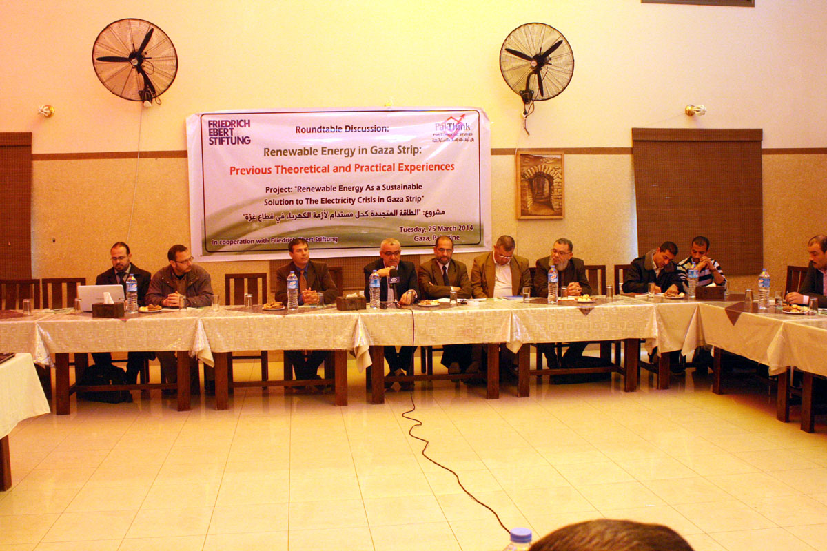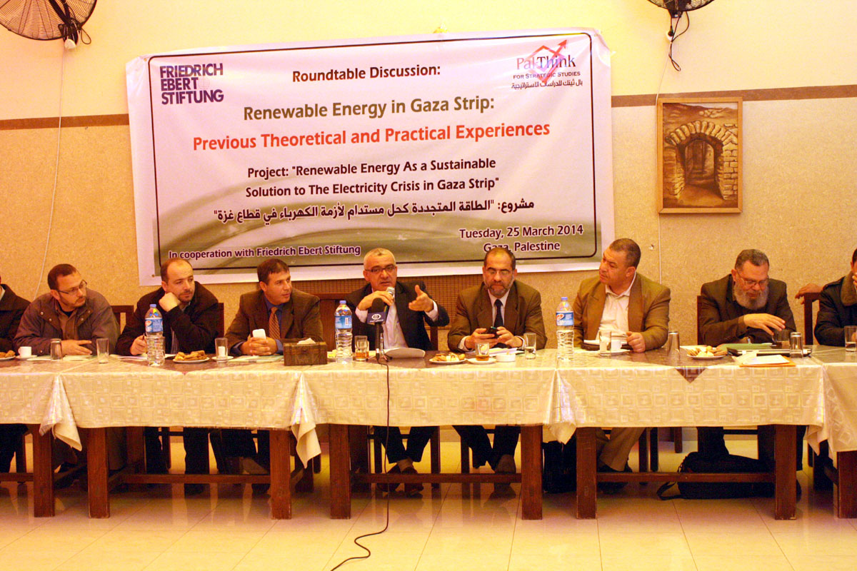 في إطار إيجاد بدائل للطاقة الحالية بأخرى صديقة للبيئة كأحدى الحلول في قطاع غزة نظمت بال ثينك للدراسات الإستراتيجية ومؤسسة فريدريش إيبرت الألمانية جلسة نقاش شاركت فيه المؤسسات الأكاديمية وأساتذة الجامعات وخبراء من المجتمع المحلي لعرض أمثلة حيوية وعملية للطاقة المتجددة تم تنفيذها في قطاع غزة وتحمل قصص نجاح .