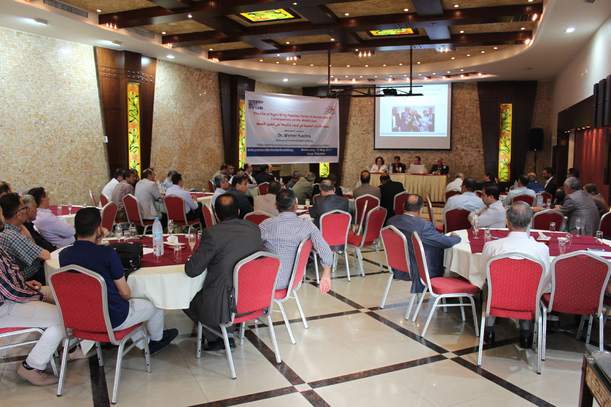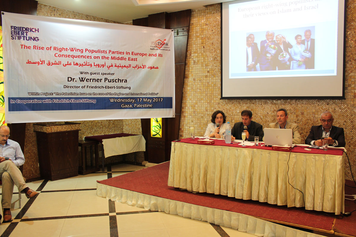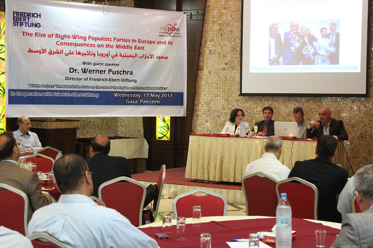 نظمت بال ثينك للدراسات الاستراتيجية بالتعاون مع مؤسسة فريدريش أيبرت الألمانية ورشة عمل تحت عنوان: صعود الاحزاب اليمينية في أور,با وتأثيرها على الشرق الأوسط، بمدينة غزة، والتي استضافت د. فيرنر بوشرا مدير مؤسسة فريدريش إبيرت الألمانية في اسرائيل، وبحضور مديرة المؤسسة في القدس د. بيهان شينتورك وممثلها في غزة د. أسامة عنتر وادار النقاش مدير مؤسسة بال ثينك للدراسات الاستراتيجية عمر شعبان، الذي قدم ترجمة لأهم ما قال الضيف.