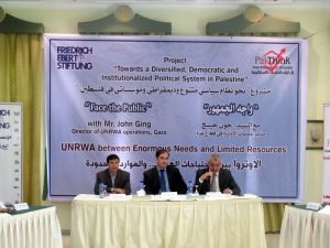 نظم “بال ثينك للدراسات الإستراتيجية” أولى جلسات برنامج “واجه الجمهور”  بعنوان  “الاونروا بين الاحتياجات الهائلة… والموارد المحدودة” باستضافة السيد جون جينج مدير عمليات وكالة الغوث وتشغيل اللاجئين الاونروا بقطاع غزة وذلك ضمن مشروع “نحو نظام سياسي متنوع وديمقراطي ومؤسساتي في فلسطين” بالشراكة مع مؤسسة فريدريش ايبرت الألمانية وذلك بمشاركة مناقشين متخصصين في هذه القضية وبحضور نخبة من السياسيين  والأكاديميين والمؤسسات الأهلية والدولية.