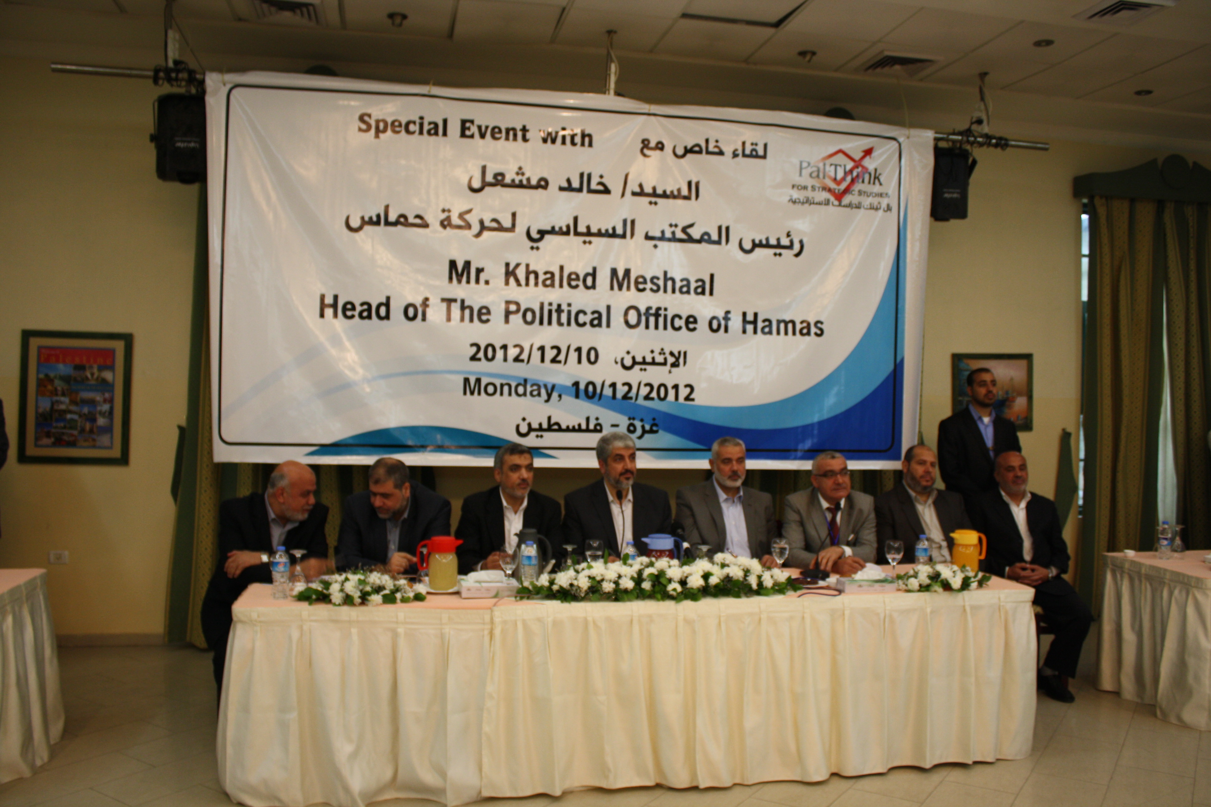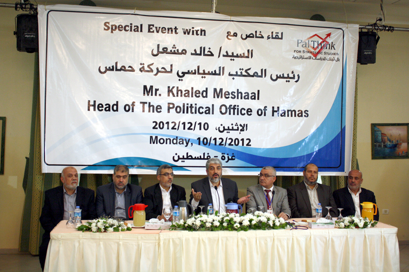 في لقاء خاص و متميز إستضاف بال ثينك للدراسات الاستراتيجية يوم الاثنين 10 ديسمبر 2012 السيد خالد مشعل، رئيس المكتب السياسي لحركة حماس. في لقاء حضره 250 شخصا يمثلون كافة شرائح المجتمع في قطاع غزة. وقد مثل اللقاء فرصة هامة و فريدة من نوعها للسيد خالد مشعل للاستماع لوجهات نظر و رؤى ممن لا ينتمون لحركة حماس مثل القضاة، الجهات الفاعلة في المجتمع المدني، قادة المجتمع المسيحي في غزة، والشباب والناشطات من النساء والمزارعين والعاطلين عن العمل ورجال الأعمال و الصيادين و المزارعين … الخ.