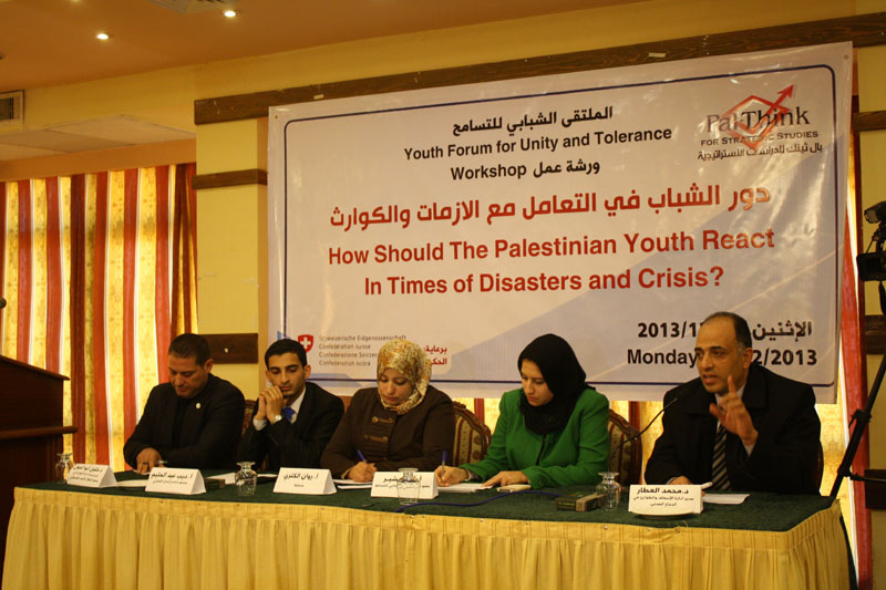 نظم الملتقى الشبابي للتسامح بمؤسسة بال ثينك ورشة عمل بعنوان دور الشباب في التعامل مع الازمات والكوارث وذلك بمشاركة اكثر من 250 مشارك من جميع شرائح وأطياف المجتمع الفلسطيني وبالتحديد فئة الشباب في فندق الكمودور بمدينة غزة .