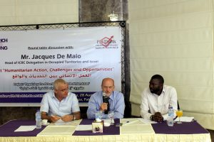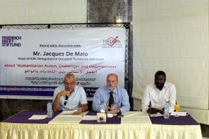 بالتعاون مع مؤسسة فريدريش أيبرت الالمانية تم عقد جلسة نقاش مفتوح وصريح مع السيد جاك دي مايو رئيس بعثة الصليب الأحمر في اسرائيل والأراضي المحتلة وذلك يوم الأحد 28 أغسطس 2016 ، تناول النقاش محددات و آفاق العمل الانساني بين التحديات والواقع و التوقعات منه. حضر الندوة التي تمت دون تغطية إعلامية 60 شخصية يمثلون قطاعات متنوعة من قوى سياسية، إعلام ، اساتذة جامعات والعديد من ممثلي المجتمع المدني ..