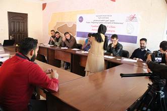 افتتحت اللقاء المتدربة سمر العزايزة مشيرة الى دور المشروع في تعزيز وعيهم بالمفاهيم الديمقراطية والثقافية، وتابعت متحدثة عن مفهوم المناصرة وأهدافها وأشكالها ووسائلها، والفرق بينها وبين الضغط، وتحدثت عن عناصر نجاح عملية المناصرة، وتناقشت المتدربة مع الحضور حول أهمية عمليات الضغط والمناصرة في إجراء تغييرات جذرية في المجتمع.