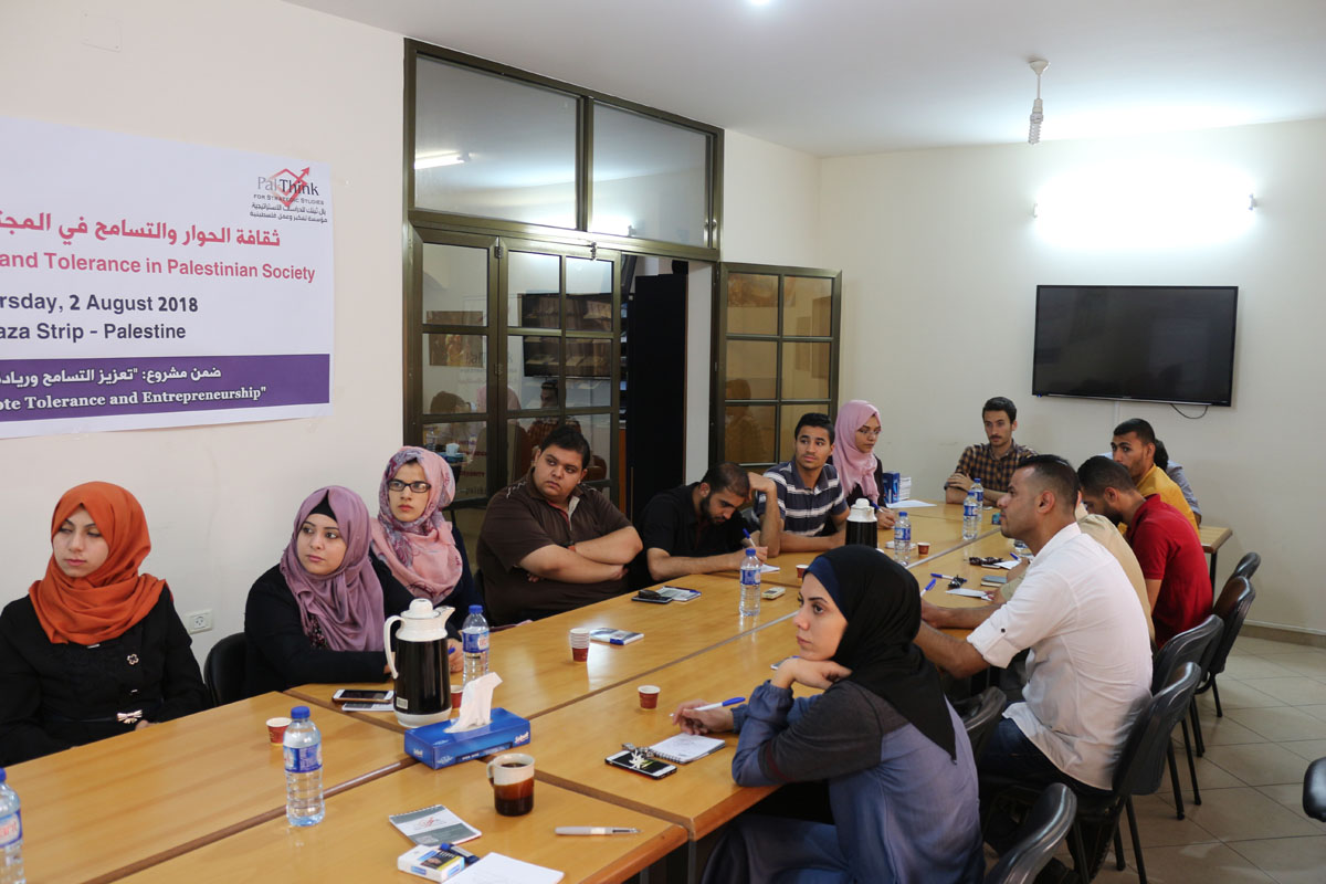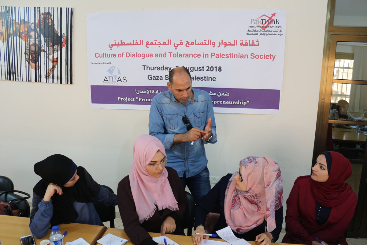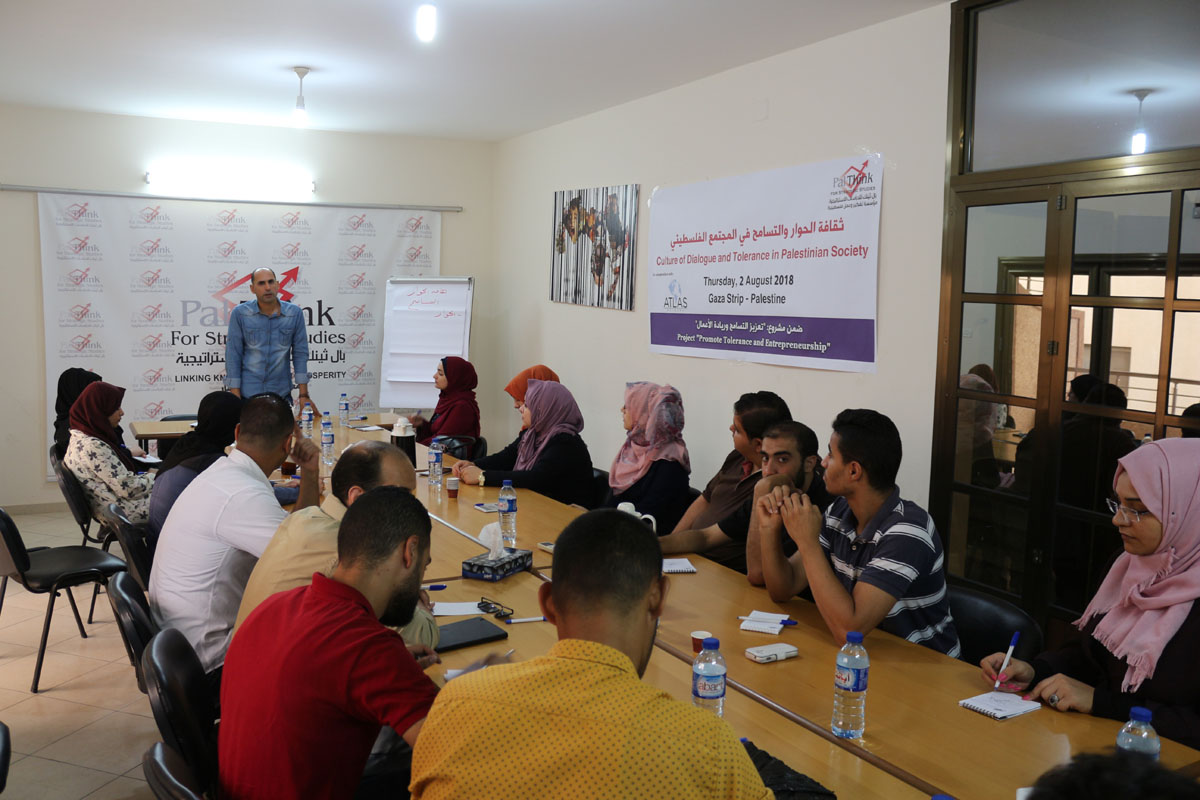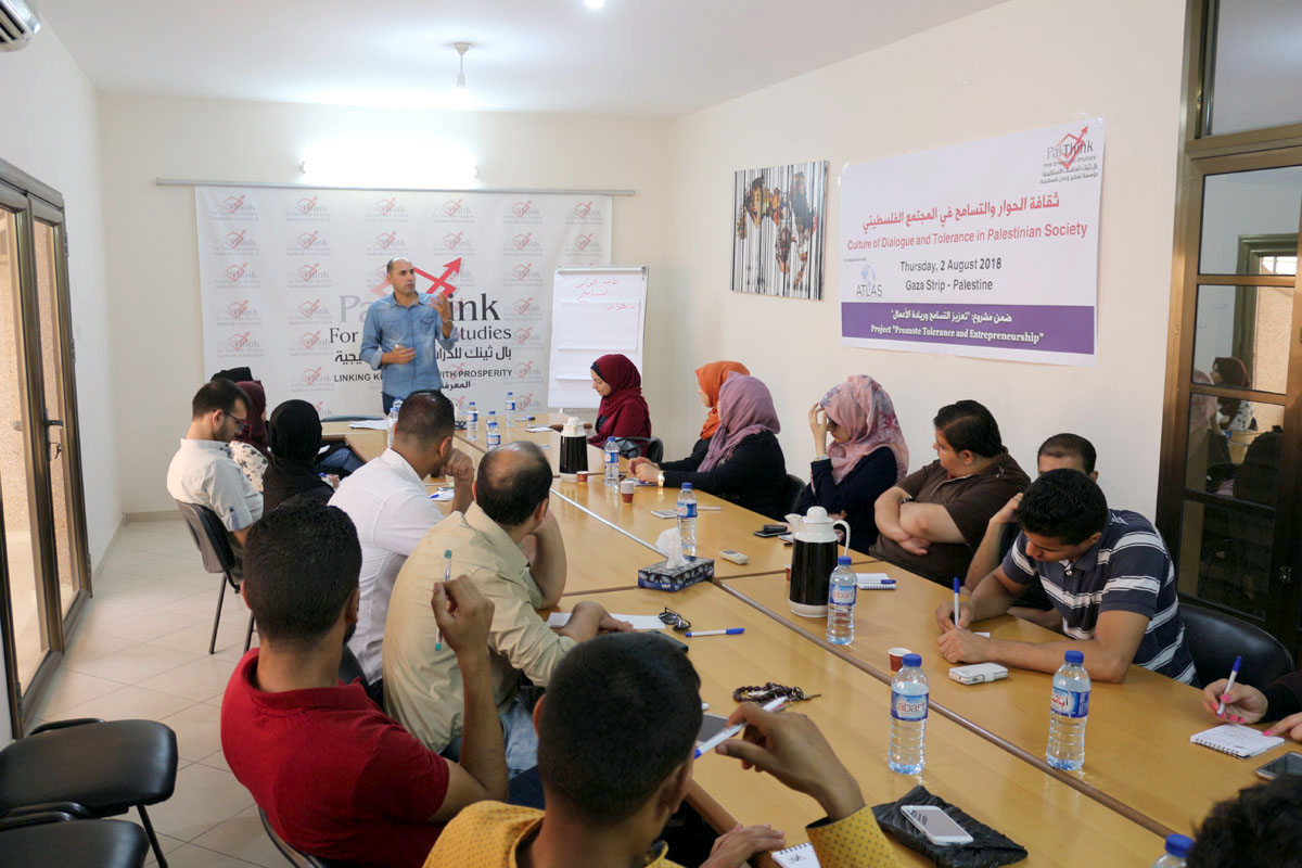 نظمت بال ثينك للدراسات الإستراتيجية محاضرة بعنوان “ثقافة الحوار والتسامح في المجتمع الفلسطيني” بحضور 20 من طلبة وخريجي الجامعات في قطاع غزة من كلا الجنسين ومختلف التخصصات، تأتي هذه المحاضرة في إطار مشروع “تعزيز التسامح وريادة الأعمال”، وهو مشروع أطلقته بال ثينك بالتعاون مع شبكة أطلس –وهي منظمة غير ربحية مقرها الولايات المتحدة الأمريكية-، حيث يهدف هذا المشروع إلى تعزيز ثقافة التسامح وريادة الأعمال والعمل الحر بين الشباب في قطاع غزة