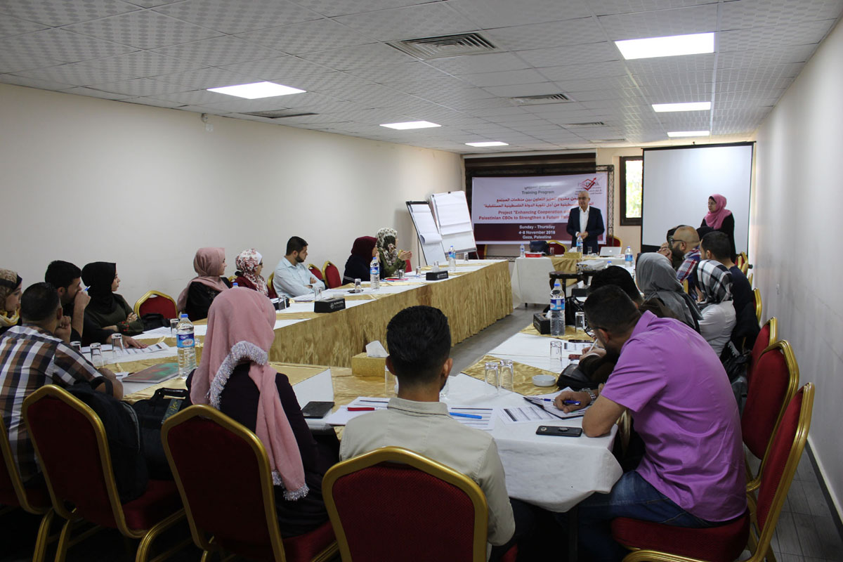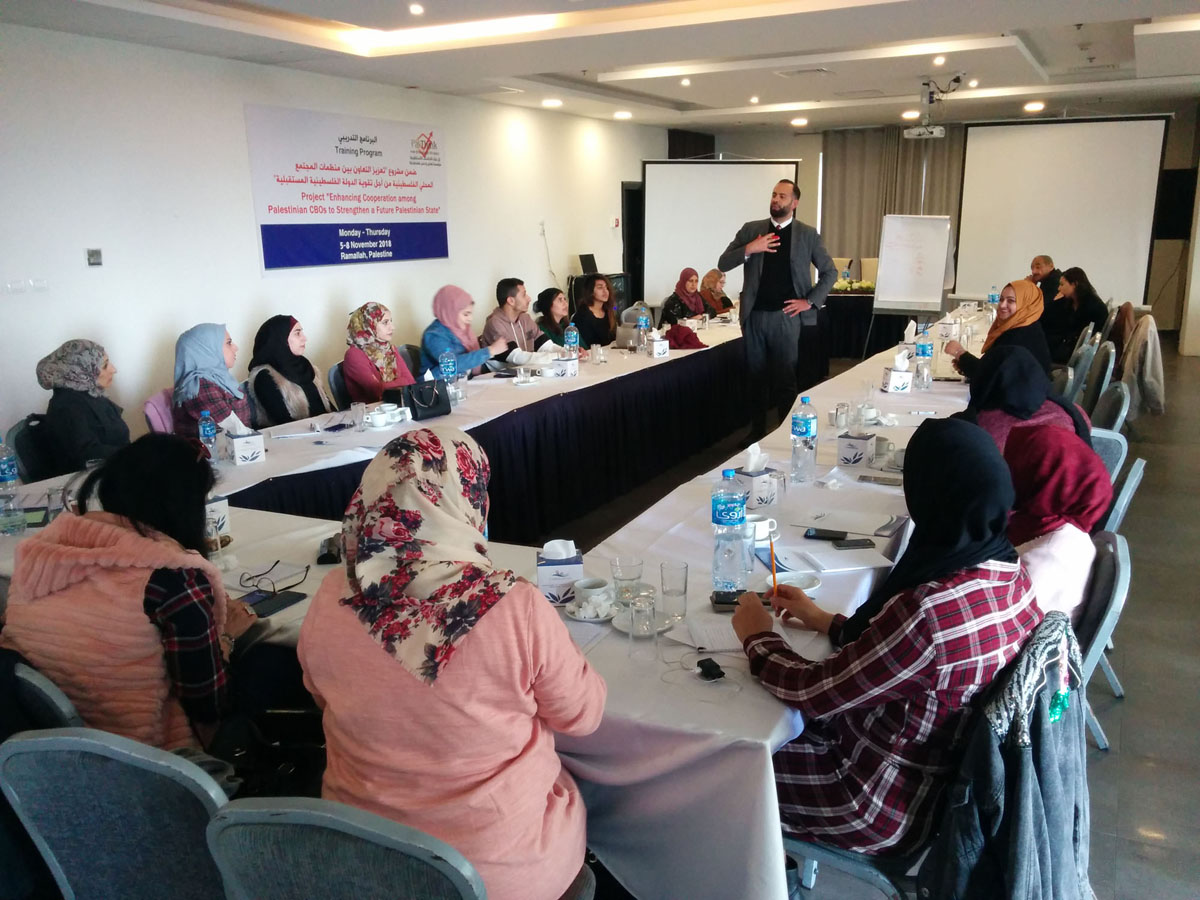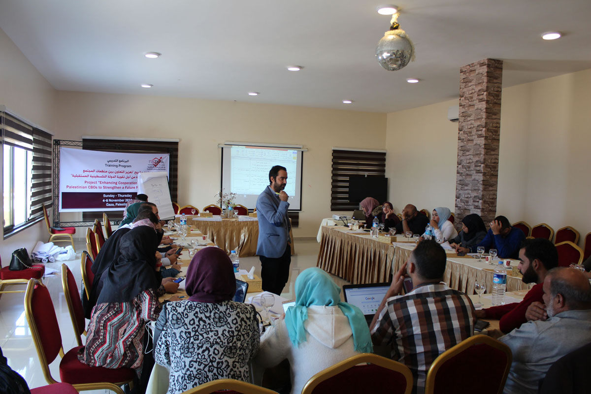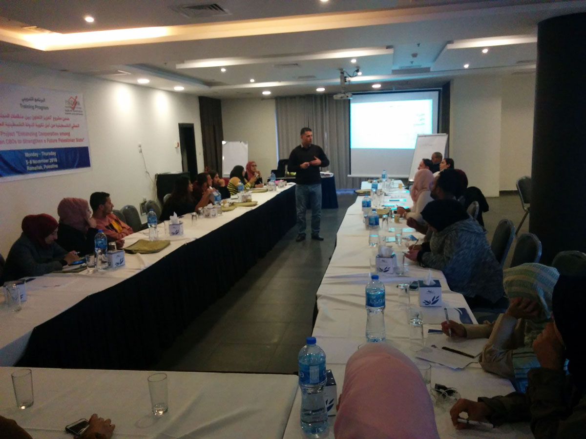واستهدف التدريب الأفراد القائمين على تنفيذ المبادرات ضمن هذا المشروع من طواقم العمل في المؤسسات الشريكة ، لتطوير قدرات المؤسسات الأهلية في المساهمة الايجابية في بناء مجتمع ودولة فلسطينية متقدمة. واستمر التدريب لمدة 5 أيام في مدينة غزة ، و4 أيام في مدينة رام الله ، على أيدي مدربين أكفاء تناولوا عدة مواضيع في إدارة المشاريع ،حقوق الانسان ، قضايا المرأة والجندر، القانون والدستور الفلسطيني ، التنمية المجتمعية وتمكين الشباب، أسس ومبادئ كتابة الأوراق البحثية ،كتابة التقارير الصحفية ، السوشيال ميديا، حيث ركز البرنامج التدريبي على تزويد المشاركين بالمبادئ الأساسية ضمن هذه المواضيع ، بما يمكنهم من إدماج هذه المبادئ في أنشطتهم في كافة المشاريع الحالية ولمستقبلية ، أيضا خلال تنفيذ مبادراتهم لتحقق أهدافها المتوقعة، حيث تأتي هذه المبادرات في المرحلة الثانية من المشروع.