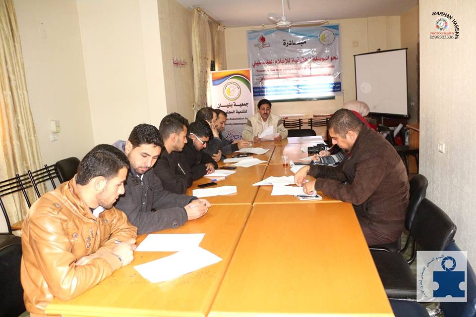 نفذت جمعية بنيان من غزة بالشراكة مع جمعية نساء عربيات من اجل القدس في مدينة القدس بمداخلات عبر المشاركة من خلال برنامج سكايب بورشة عمل لمناقشة الورقة البحثية وذلك بالتعاون مع التجمع الصحفي الفلسطيني لحقوق الانسان وذلك يوم الاحد الموافق 30/12/2018 م وتأتي هذا الورشة ضمن انشطة مبادرة ” نحو البوصلة الحقيقة للأعلام الفلسطيني ” التي تنفذها الجمعية مع مؤسسة بال ثينك للدراسات الاستراتيجية ضمن انشطة مشروع “تعزيز التعاون بين منظمات المجتمع المحلي الفلسطينية من اجل تقوية الدولة الفلسطينية المستقبلية “