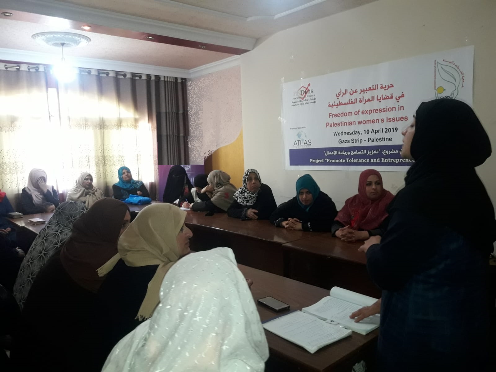 نفذت جمعية الشباب والبيئة ومؤسسة بال ثينك للدراسات الاستراتيجية محاضرة بعنوان “حرية التعبير عن الرأي حول قضايا المرأة الفلسطينية” وذلك ضمن مشروع “تعزيز التسانح وريادة الأعمال” الممول من شبكة أطلس، وذلك في مقر الجمعية في دير البلح وهدفت المحاضرة التي القتها المحامية فداء البحيصي الى تسليط الضوء على حقوق المرأة النابعة من حقوق الإنسان، وشملت الورشة حقوق المرأة في كل جوانب الحياة المتعلقة بها، سواء حقها في العمل، التعليم،الحرية، اتخاذ القرار، وغيرها من الحقوق وركزت الورشة كذلك على حق المرأة في التعبير عن رأيها والتي تعتبر من الحقوق المهمة للمرأة، وحرية التعبير عن الرأي هي قدرة المرأة على اعتناق الآراء دون إكراه، والقدرة على التعبير عنها بوسائل متعددة دون تهديد وعوائق خارجية.