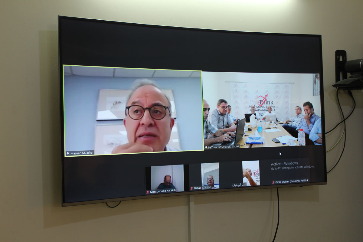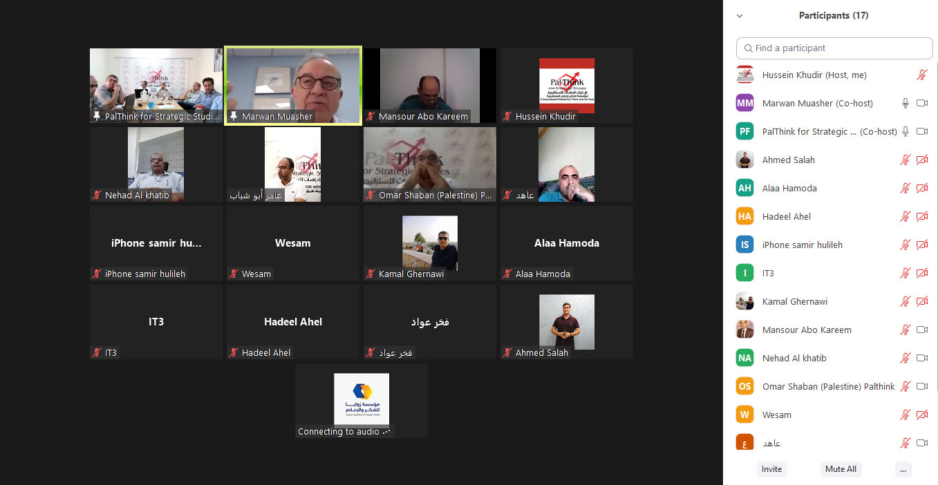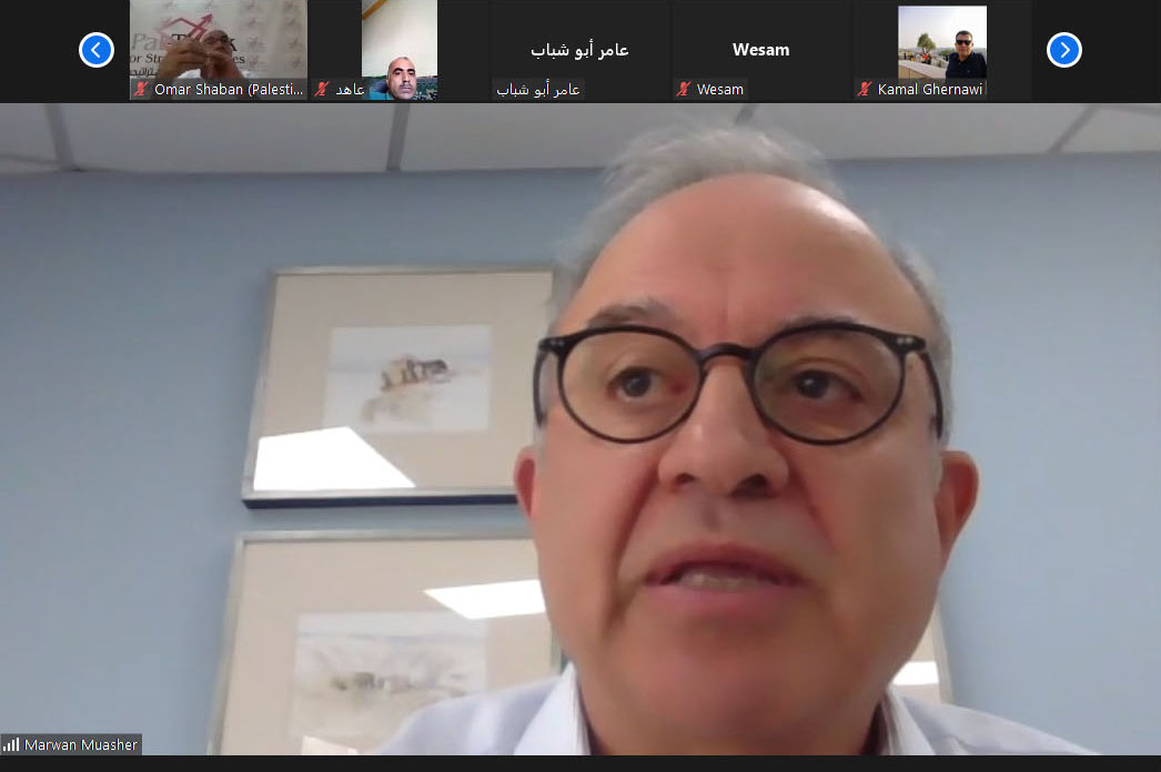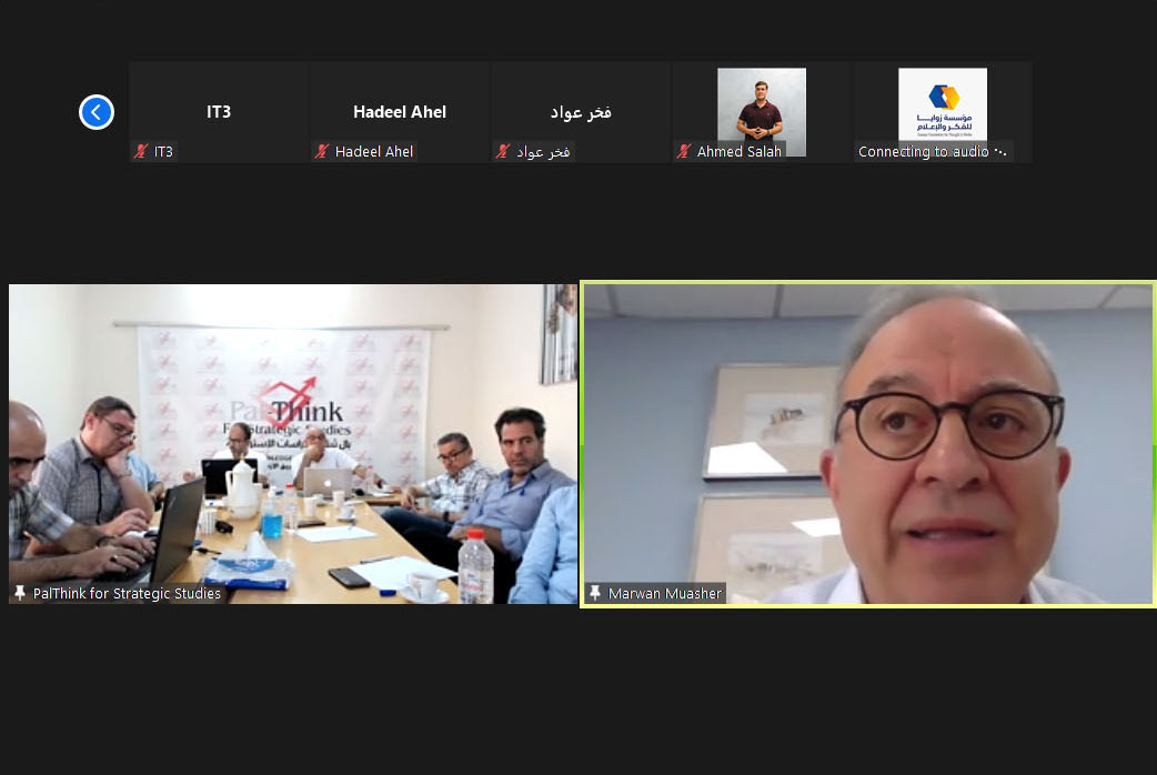 وقال المعشر خلال ندوة فكرية نظمتها مؤسستي زوايا للفكر والإعلام وبال ثينك للدراسات الاستراتيجية“، شارك فيها نخبة من الكتاب والباحثين الفلسطينيين عبر تقنية الزوم: “إن “إسرائيل” استخدمت التشبث اللفظي بحل الدولتين، من أجل خلق حقائق على الأرض كل يوم، من مستوطنات وغير ذلك، وفعليا هي تهدف للقضاء على حل الدولتين، إضافة إلى أن “إسرائيل” تقول صراحة أنها لا تريد حل الدولتين”، ولا تريد الانسحاب من الأراضي العربية المحتلة.
