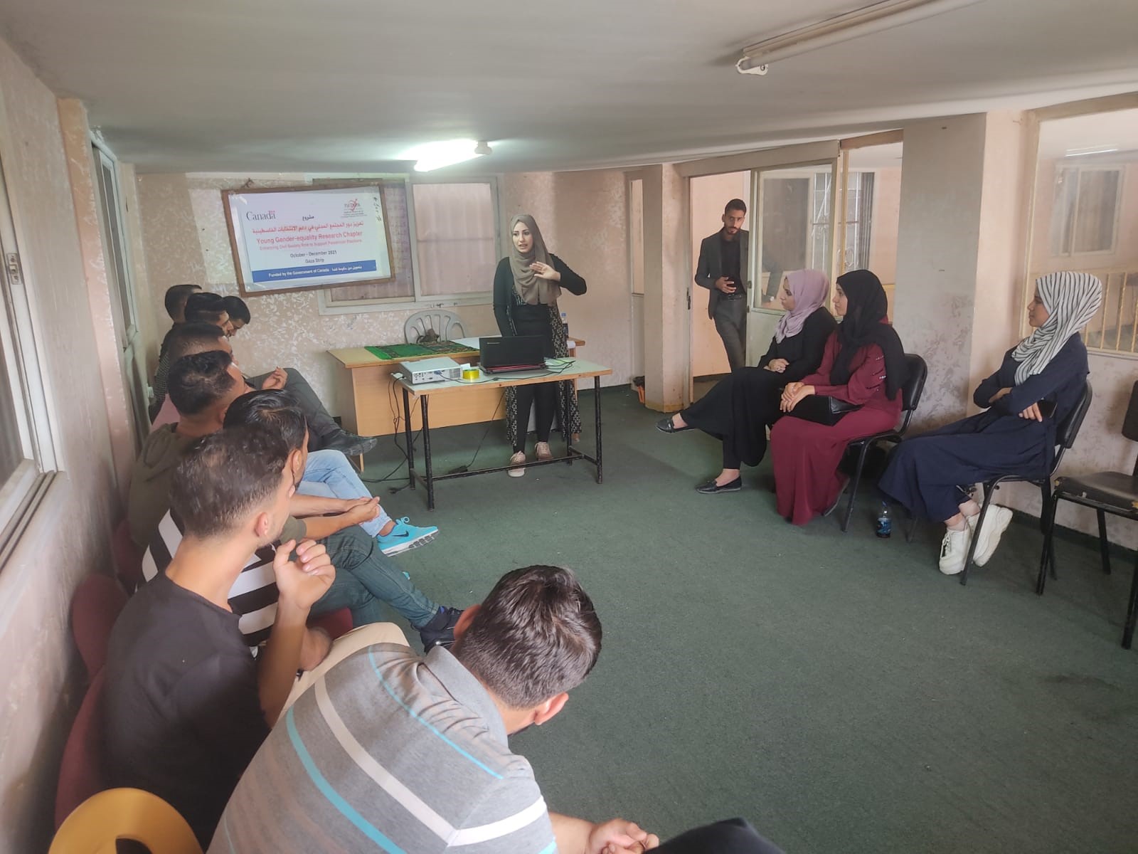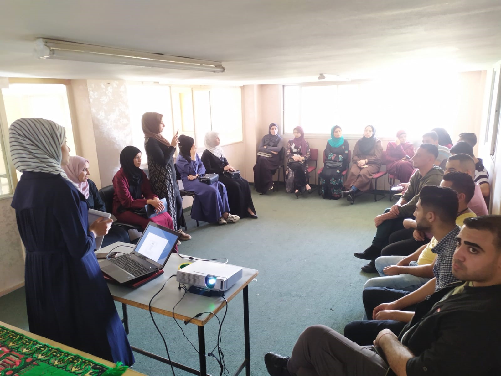 اما اللقاء الثاني والذي تم بالتعاون مع جمعية الوفاق لرعاية المرأة والطفل،  فقد أدار اللقاء كل من المتدربين عهد عبدالله، و زينب الازعر أمير حسنين حول موضوع ” العدالة الجندرية” وبحضور مجموعة من النساء وناشطات من المجتمع المدني. تناول اللقاء مفهوم العدالة الجندرية والعنف المبني على النوع الاجتماعي، موضحين أهمية العدالة الجندرية والمساواة وأثرهم على المرأة في المجتمع الفلسطيني، كما واستعرض المحاضرين المعيقات والتحديات التي تواجه المجتمع فلسطيني لمنع العنف ضد المرأة، وآليات مواجهته. ودار النقاش مع الحضور حول اهم الادوار التي يمكن ان تقوم بها المرأة  لمواجهة العنف والتحديات التي تعيق تقدمها واثبات مشاركتها في المجتمع.