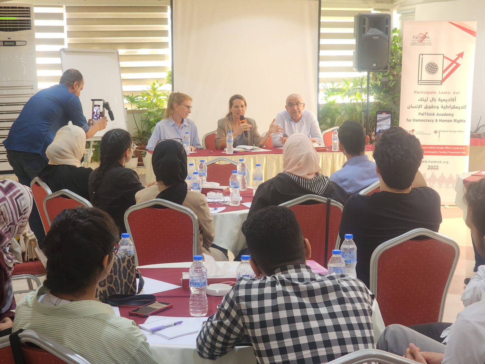 استمرارًا لجهودها الدؤوبة في رفع الوعي الشباب وكسر الحصار المعرفي والعزلة الثقافية عنهم، عقدت مؤسسة “بال ثينك للدراسات الاستراتيجية” لقاءًا حواريًا مع ممثلي مكتب الاتحاد الأوروبي في القدس وذلك ضمن أنشطة وفعاليات مشروع “أكاديمية بال ثينك للديمقراطية وحوق الانسان” الذي تنظمه بال ثينك بالشراكة مع معهد العلاقات الخارجية الألماني.