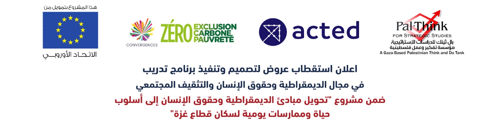 تعمل بال ثينك للدراسات الاستراتيجية بالشراكة مع مؤسسة أكتيد (Acted)، ومؤسسة Convergences، بتمويل من المفوضية الأوروبية EU على تنفيذ مشروع “تحويل مبادئ الديمقراطية وحقوق الإنسان إلى أسلوب حياة وممارسات يومية لسكان قطاع غزة”، بهدف المساهمة في تعزيز قيم وممارسات الديمقراطية والحقوقية والثقافة المدنية في المجتمع من خلال: