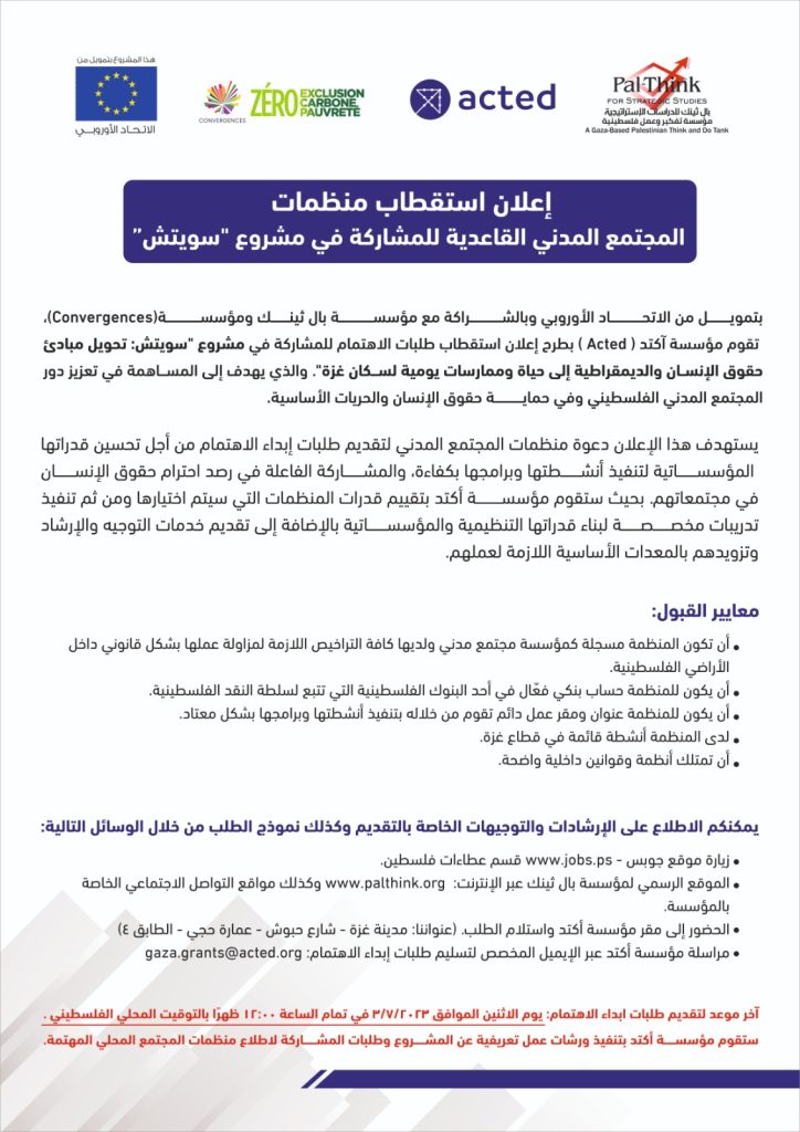 بتمويل من الاتحاد الأوروبي وبالشراكة مع مؤسسة بال ثينك ومؤسسة (Convergences)، تقوم مؤسسة أكتد (Acted) بطرح إعلان استقطاب طلبات الاهتمام للمشاركة في مشروع “سويتش: تحويل مبادئ حقوق الإنسان والديمقراطية إلى حياة وممارسات يومية لسكان غزة“. والذي يهدف إلى المساهمة في تعزيز دور المجتمع المدني الفلسطيني وفي حماية حقوق الإنسان والحريات الأساسية. يستهدف هذا الإعلان […]