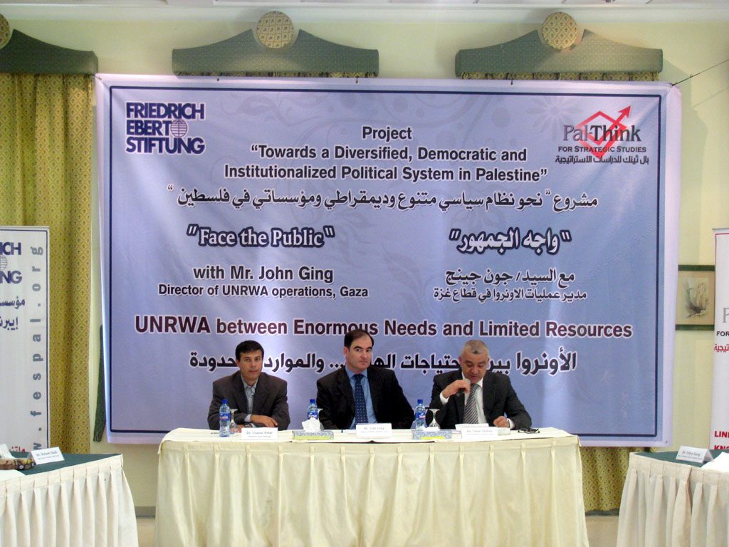 الأربعاء 19 / 05 / 2010 م نظم “بال ثينك للدراسات الإستراتيجية” أولى جلسات برنامج “واجه الجمهور” بعنوان “الاونروا بين الاحتياجات الهائلة… والموارد المحدودة” باستضافة السيد جون جينج مدير عمليات وكالة الغوث وتشغيل اللاجئين الاونروا بقطاع غزة وذلك ضمن مشروع “نحو نظام سياسي متنوع وديمقراطي ومؤسساتي في فلسطين” بالشراكة مع مؤسسة فريدريش ايبرت الألمانية وذلك […]