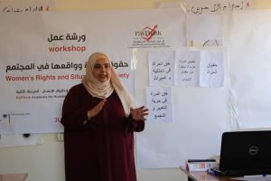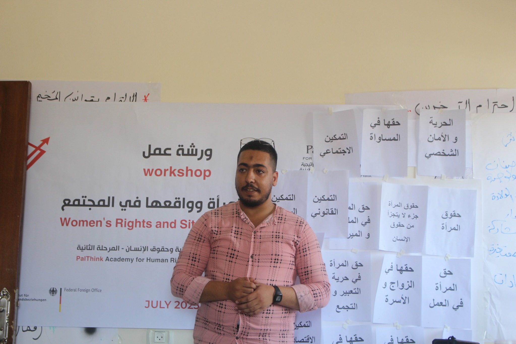 استعرض المدربين واقع حقوق المرأة في فلسطين، وأهم التحديات التي تواجهها. واستكمل عضو الفريق، كامل جودة، بشرح مفصل حول التشريعات الفلسطينية والدولية المتعلقة بحماية حقوق المرأة، وسلط الضوء على المبادرات المجتمعية التي تعنى بدعم حقوق المرأة وتحسين واقعها في محاولات جادة للتغلب على التحديات التي تواجهها.