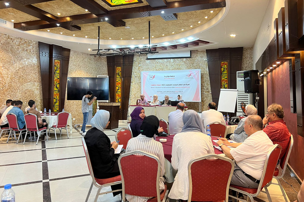 وتلا عرض الورقة حوار معمق شارك فيه الحضور حول قضايا عدة متعلقة بوضع النساء منها تحرك المرأة للوصول لحقوقها بنفسها، والتنشئة والتوعية في المدارس حول حقوق المرأة، والمعيقات العملية الإجرائية أمام حصول المرأة على حقوقها، ومشاركة المرأة في إصلاح النظام السياسي الفلسطيني، وأثر غياب النظام السياسي والانقسام على حقوق المرأة، وتعامل الأحزاب السياسية مع المرأة.